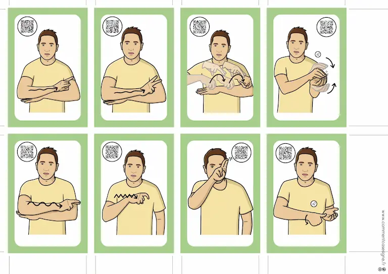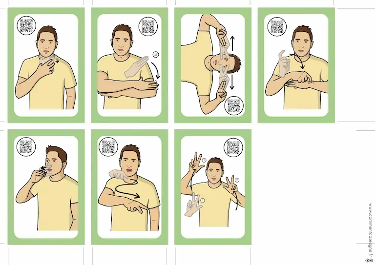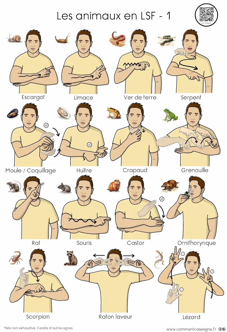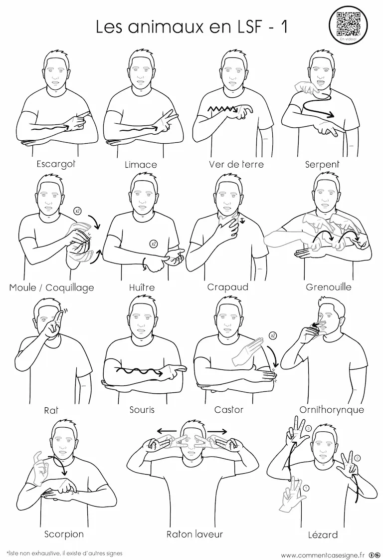 Ce support est complété par des flashcards sur les animaux, chacune accompagnée d’un QR code renvoyant vers la vidéo du signe en LSF, afin de faciliter la mémorisation et l’apprentissage en autonomie ou en groupe.