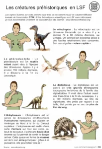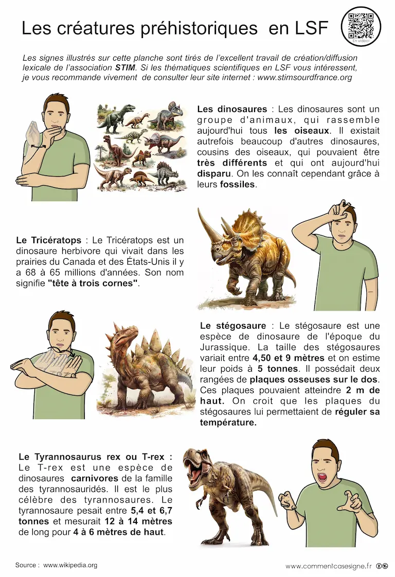 Description : Planches explicatives sur le thème des dinosaures et des créatures préhistoriques en LSF (Langue des Signes Française). Chaque planche propose  : des illustrations des signe en LSF, une description écrite du dinosaure, un QR code renvoyant vers une vidéo du vocabulaire signé en LSF.