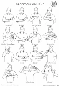Description : Signaire à imprimer sur le thème des animaux en LSF (Langue des Signes Française). Il permet de découvrir et de travailler le vocabulaire animalier, notamment des animaux souvent moins représentés, de manière visuelle et accessible.