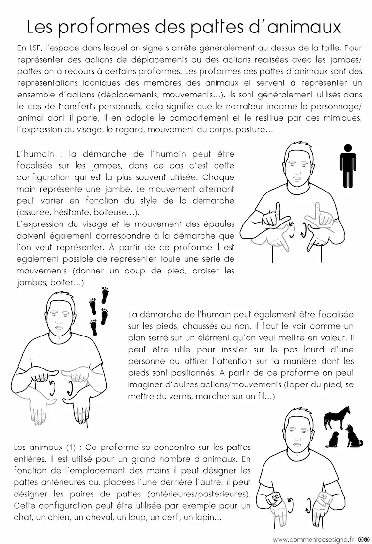 Description : Planches explicatives en noir et blanc sur les proformes de pattes d’animaux en LSF (Langue des Signes Française). Ces supports permettent de comprendre et d’observer comment les proformes sont utilisées pour représenter différents types de pattes d’animaux selon leur forme, leur appui et leur déplacement. Ces planches sont conçues pour un usage pédagogique, notamment en classe, en formation LSF ou dans un cadre d’analyse linguistique.
