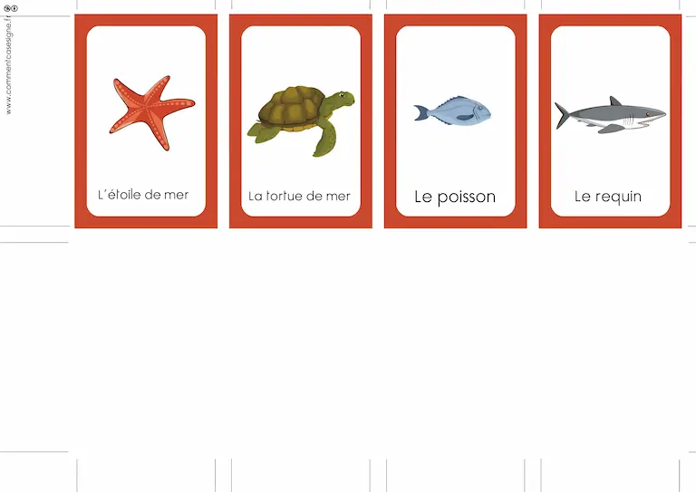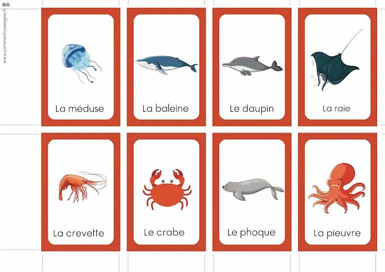Liste des signes : baleine, méduse, poisson, requin, crevette, étoile de mer, crabe, pieuvre, phoque, dauphin, tortue de mer, raie.