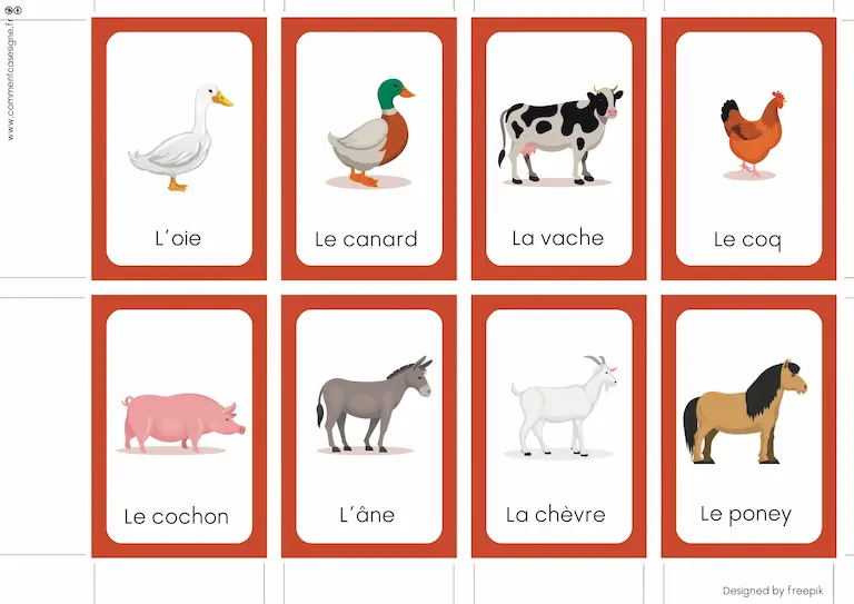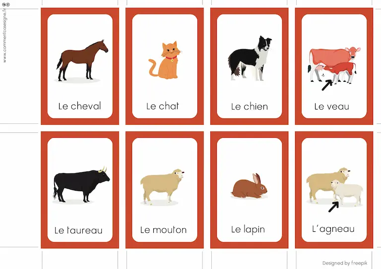 Liste des signes : mouton, agneau, poney, cochon, vache, taureau, veau, chien, chat, cheval, lapin, canard, âne, oie, chèvre, coq.