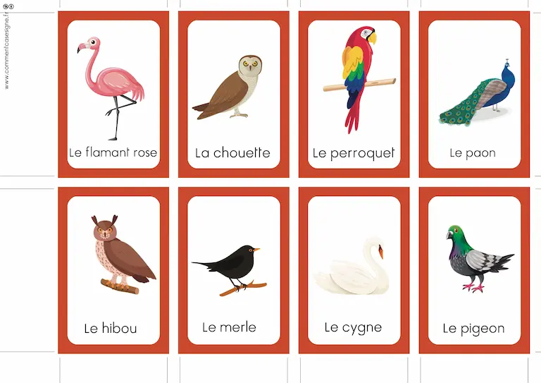 Liste des signes : Perroquet, corbeau, cygne, pigeon, chouette, paon, hibou, flamant rose, hirondelle, héron cendré, aiglé, merle.