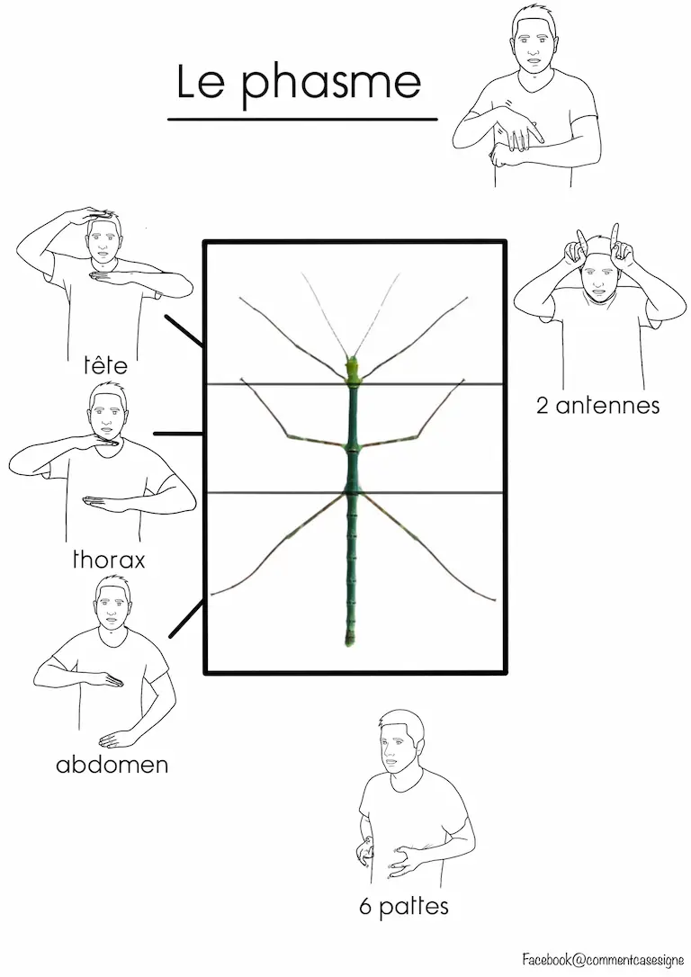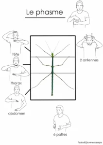 Description : Planche anatomique sur le phasme en LSF (Langue des Signes Française). Il permet de découvrir et de travailler le vocabulaire lié au phasme.