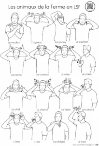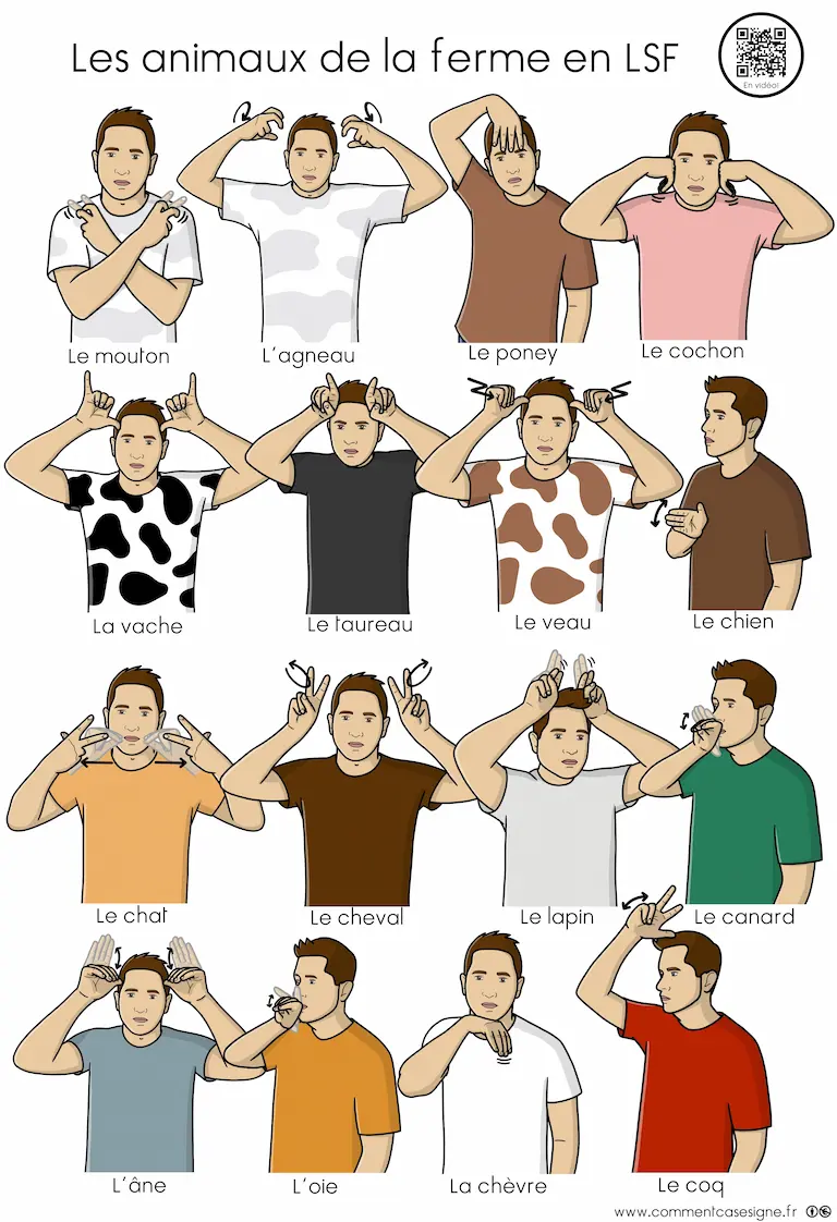 Description : Signaire à imprimer sur le thème des animaux de la ferme en LSF (Langue des Signes Française) avec QR code renvoyant vers la vidéo des signes. Il permet de découvrir et de travailler le vocabulaire animalier. Le signaire est disponible en version couleur et noir et blanc et est complété par des flashcards.
