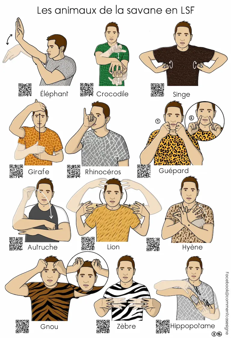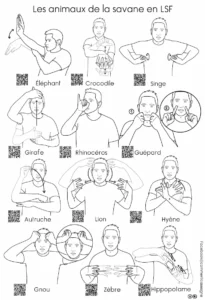 Description : Signaire à imprimer sur le thème des animaux de la savane en LSF (Langue des Signes Française). Il permet de découvrir et de travailler le vocabulaire animalier. Le signaire est disponible en version couleur et noir et blanc avec QR codes.