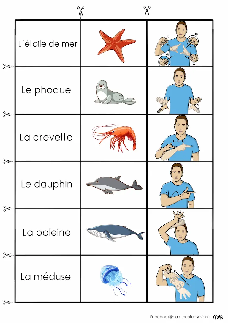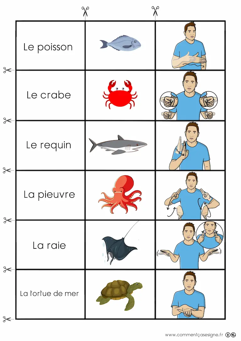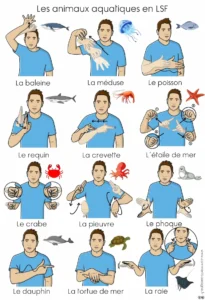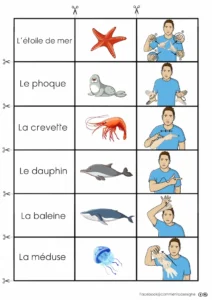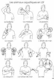 Description : Signaire à imprimer sur le thème des animaux aquatiques en LSF (Langue des Signes Française). Il permet de découvrir et de travailler le vocabulaire animalier. Le signaire est disponible en version couleur et en noir et blanc.
