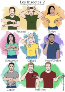 Liste des signes : insectes, phasme, papillon, mouche, mante religieuse, coccinelle, libellule, moustique, fourmi, guêpe, sauterelle, cafard, perce oreille, cigale, bourdon.