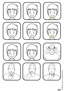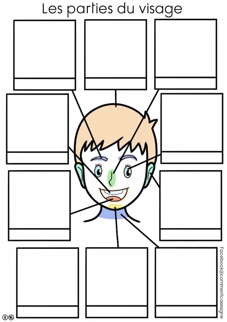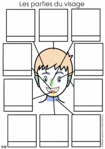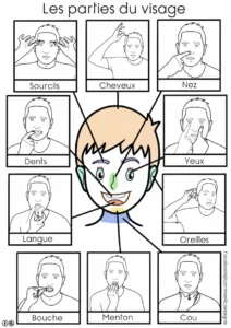 – un support illustré pour replacer les étiquettes des parties du visage (mot – signe illustré – image),