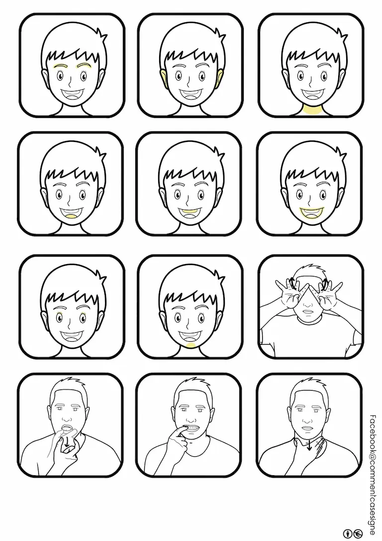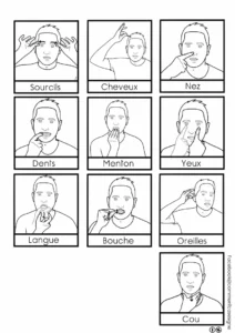 – deux signaires en noir et blanc : l’un sur les parties du corps, l’autre sur les parties du visage.