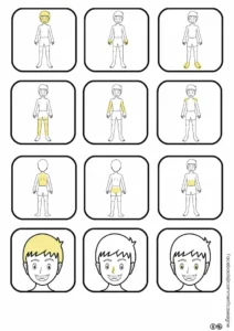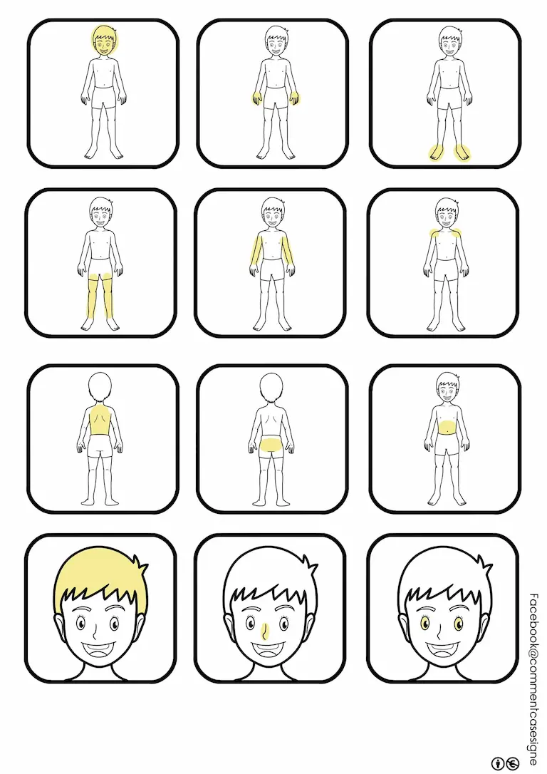 – un jeu de mémory des parties du corps et du visage (image – mot – signe),