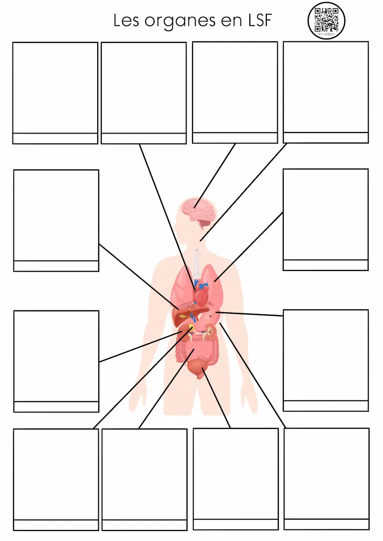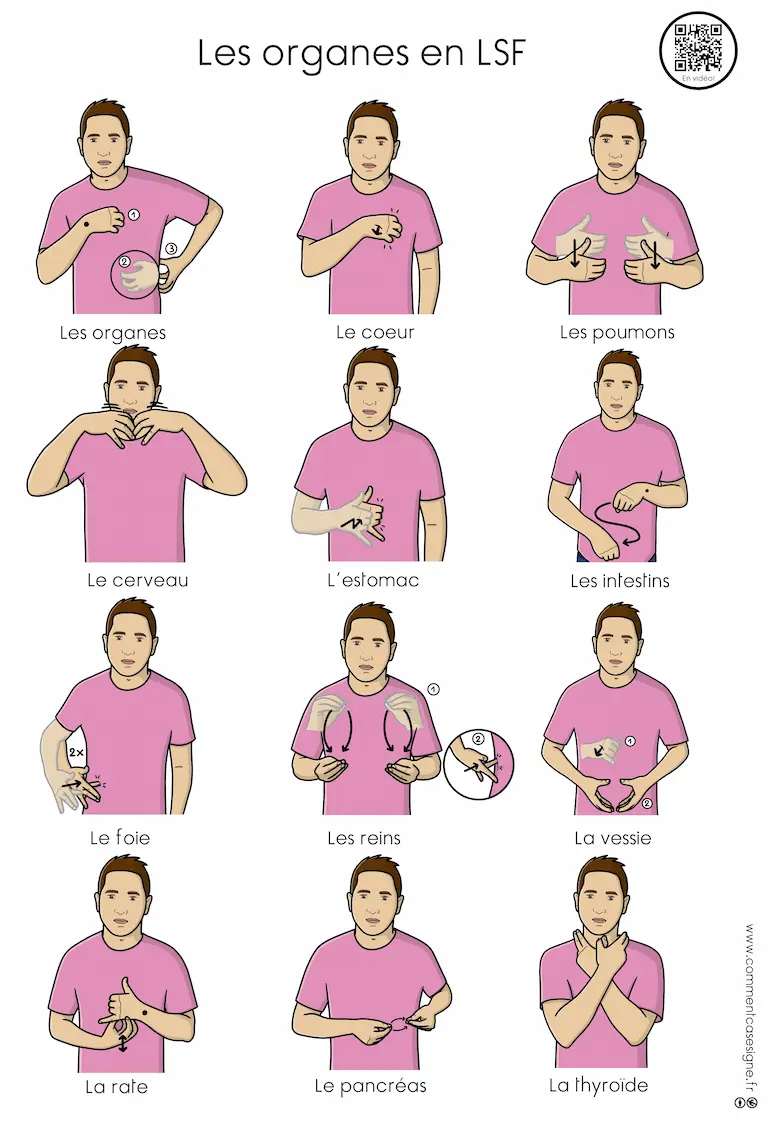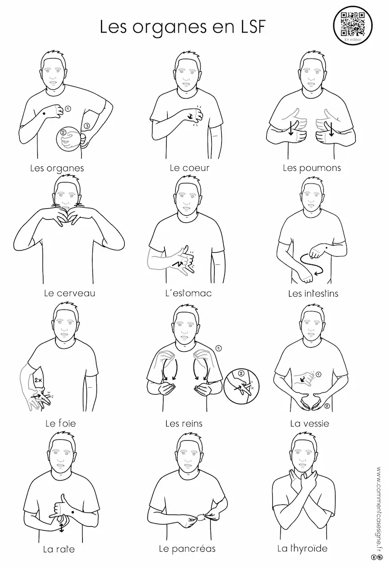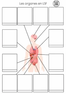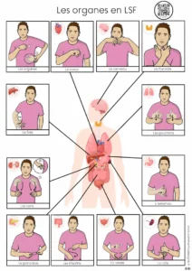 Description : Signaire à imprimer sur le thème des organes du corps humain en LSF (Langue des Signes Française). Il permet de découvrir et de travailler le vocabulaire anatomique de manière visuelle, structurée et accessible.