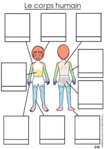 – un schéma du corps humain avec étiquettes à repositionner, associant image, signe illustré et mot écrit,
