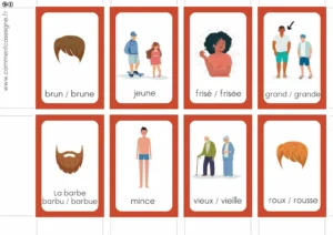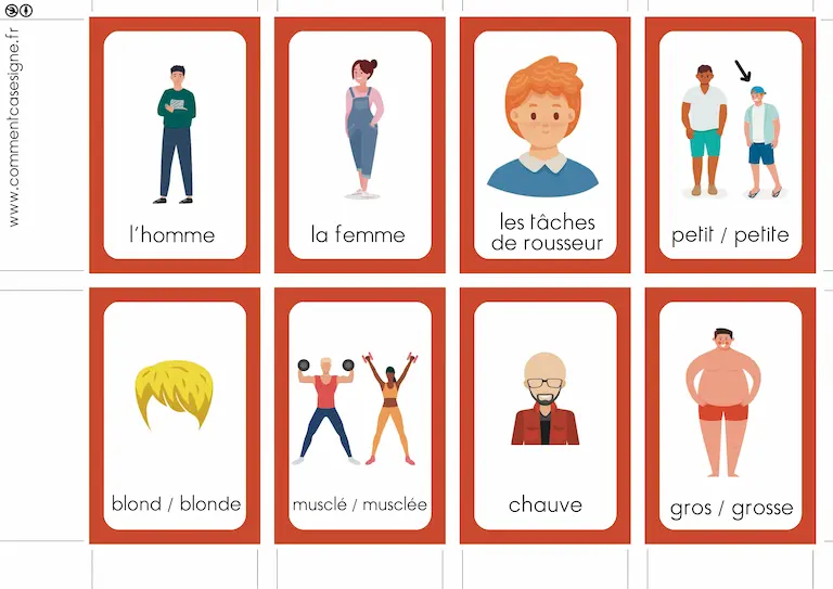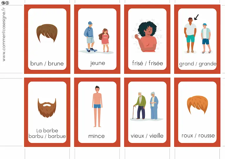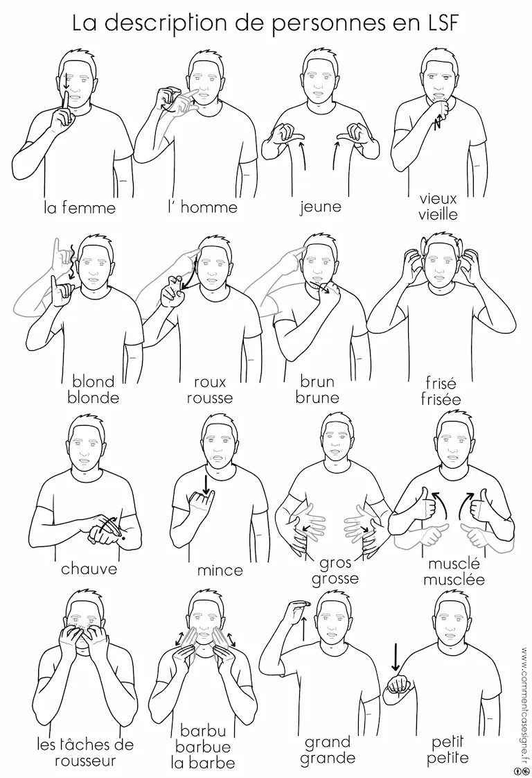 Liste des signes : femme, homme, jeune, vieux, vieille, blond, blonde, roux, rousse, brun, brune, frisé, frisée, chauve, mince, gros, grosse, musclé, musclée, taches de rousseur, barbe, barbu, barbue, grand, grande, petit, petite.