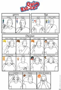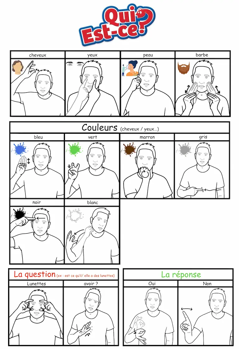 Support pédagogique conçu pour faciliter le jeu du “Qui est-ce ?” en LSF (Langue des Signes Française). Il permet de travailler la description physique, les questions fermées, ainsi que les réponses oui / non, en lien avec l’observation et la catégorisation.