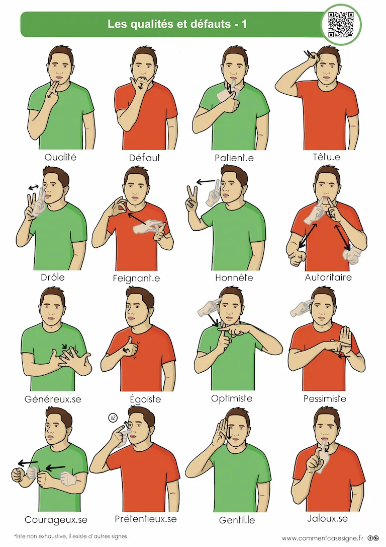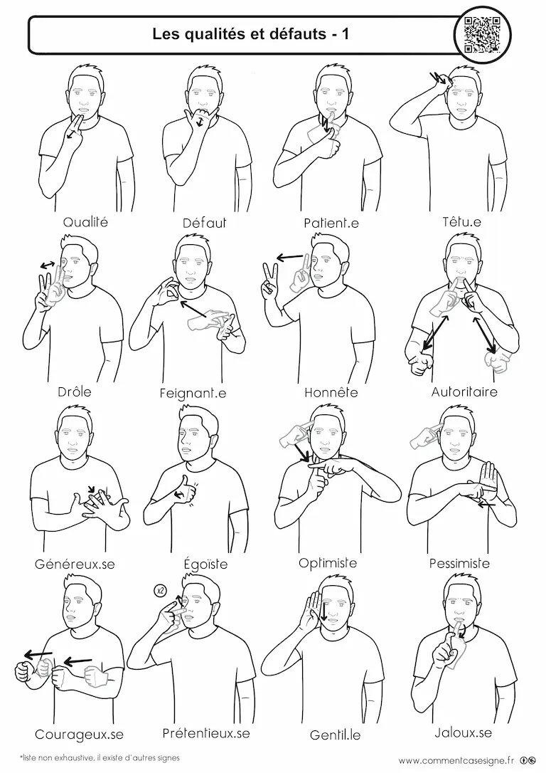 Description : Signaire à imprimer sur le thème des qualités et défauts en LSF (Langue des Signes Française). Il permet d’aborder le vocabulaire lié aux qualités et défauts des personnes.