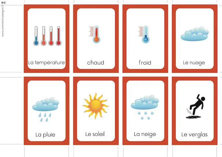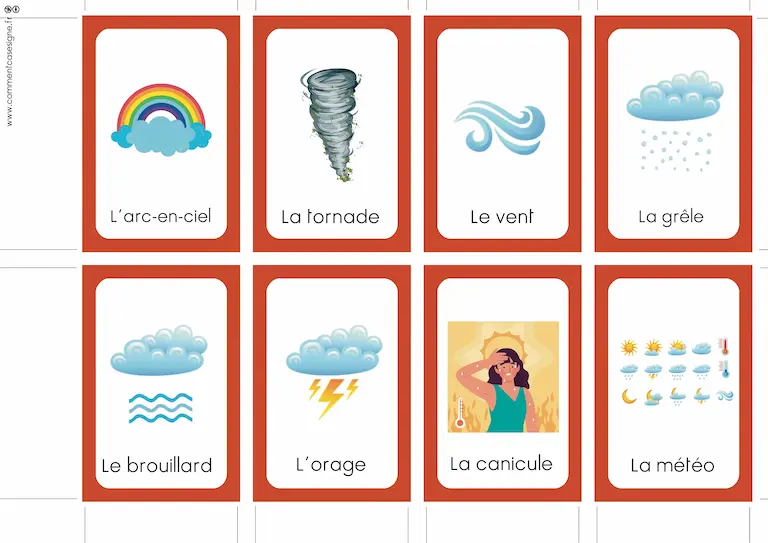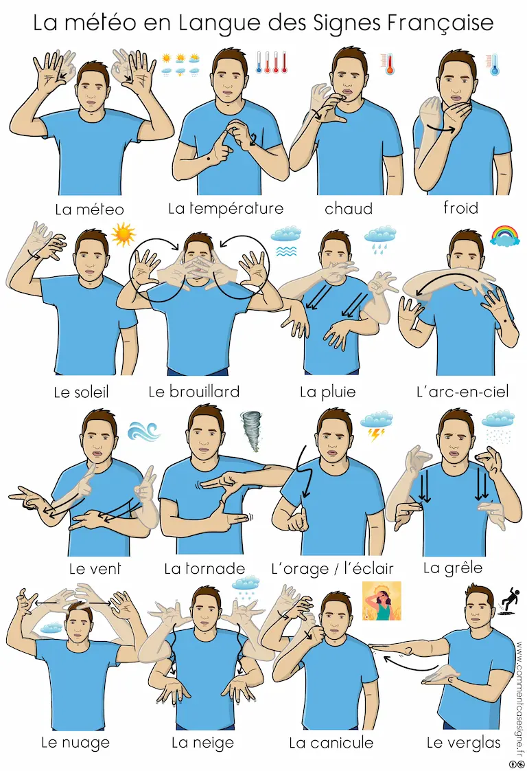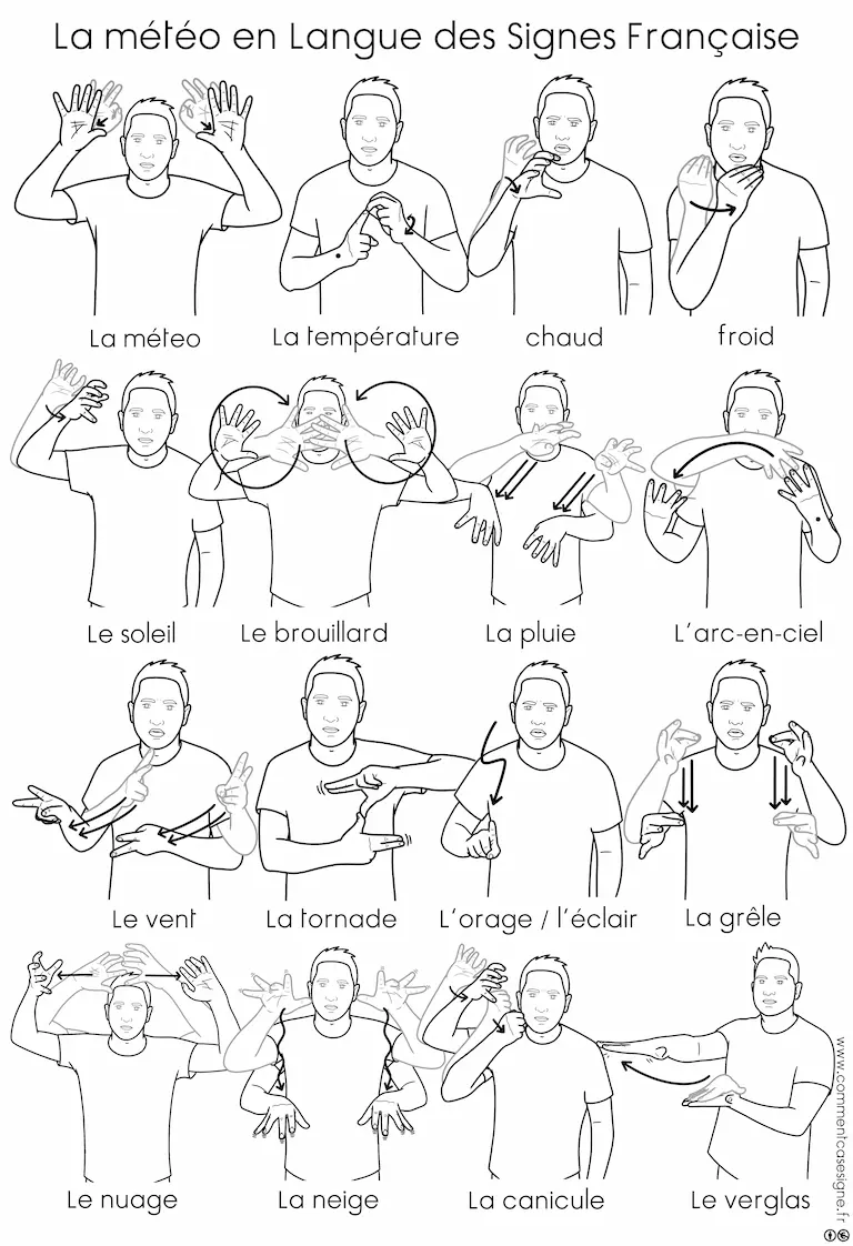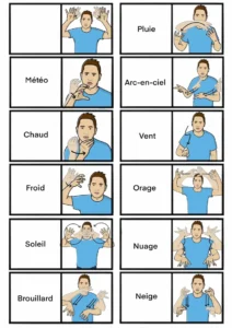 Vous trouverez ici un ensemble de ressources en Langue des Signes Française sur la météo. Cette page rassemble des signaires thématiques, des jeux de cartes, des mémoris, des dominos, ainsi que des vidéos pour apprendre et pratiquer les signes liés à la météo. Bonne exploration !
