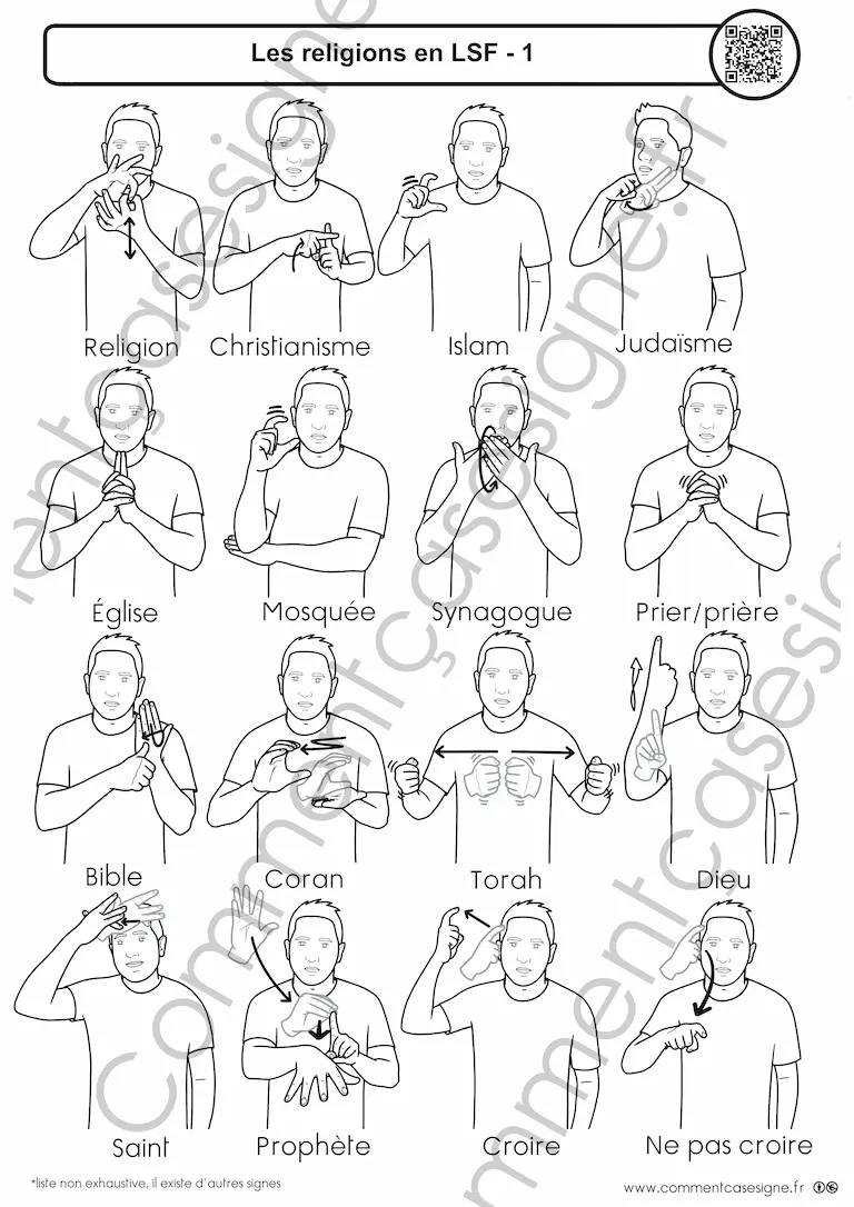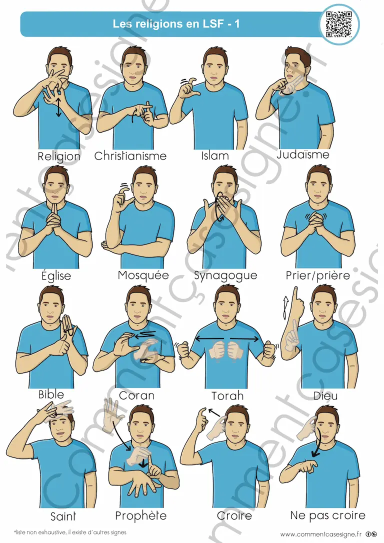 Description : Signaire à imprimer sur le thème de la religion en LSF (Langue des Signes Française). Il permet d’aborder les principales religions, les lieux de culte et le vocabulaire associé de manière neutre, claire et accessible, dans un cadre pédagogique.