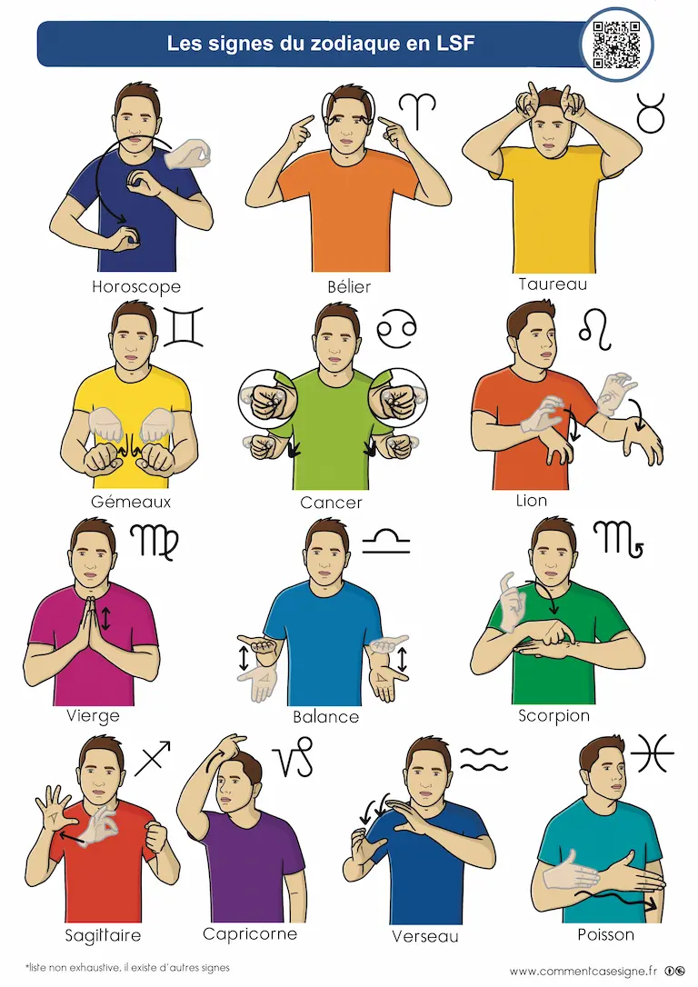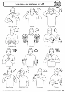 Description : Signaire à imprimer sur le thème des signes du zodiaque en LSF (Langue des Signes Française). Le signaire est disponible en version couleur et en noir et blanc, et chaque illustration est accompagnée d’un QR code renvoyant vers la vidéo du signe en LSF.
