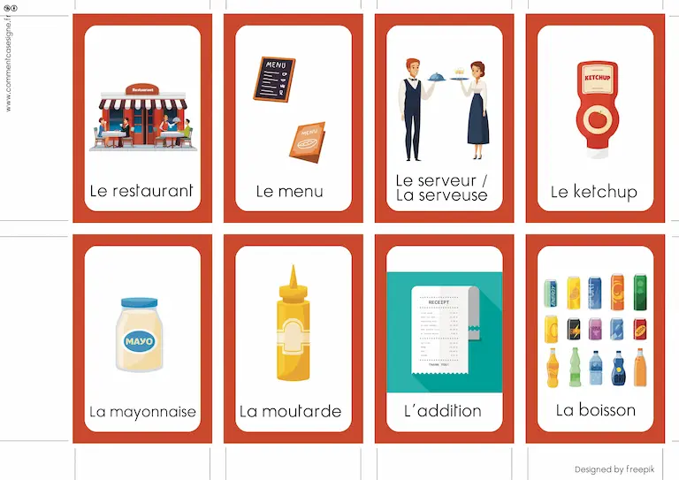Liste des signes : restaurant, bonjour, s’il te plaît / s’il vous plaît, merci, commander, réserver / réservation, menu, entrée, plat, dessert, serveur / serveuse, boisson, ketchup, mayonnaise, moutarde, addition / note.