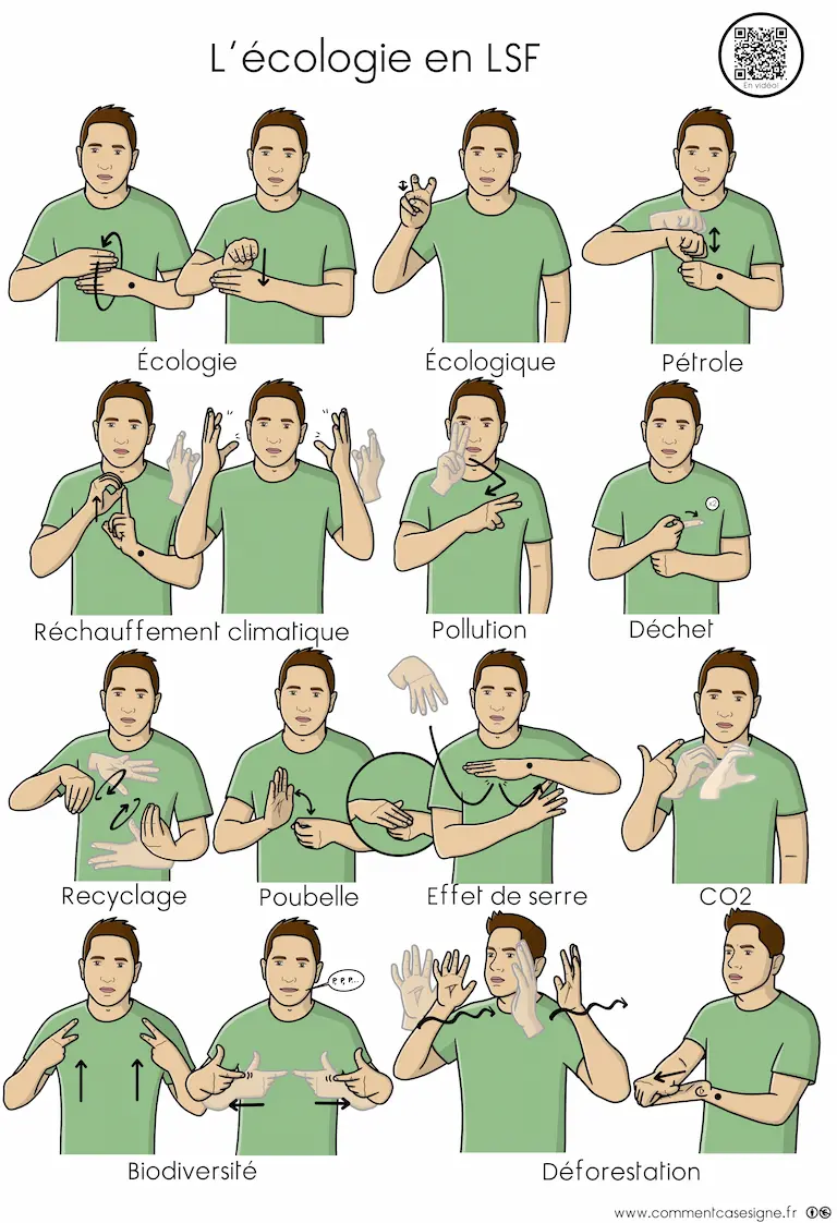 Vous trouverez ici un ensemble de ressources en Langue des Signes Française sur l’écologie. Cette page rassemble des signaires thématiques, des jeux de cartes, des mémoris, des dominos, ainsi que des vidéos pour apprendre et pratiquer les signes liés à l’écologie. Bonne exploration !