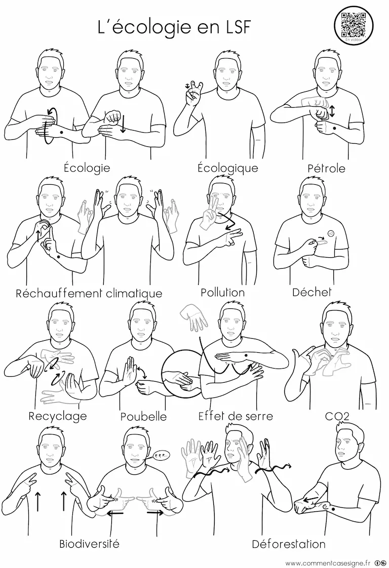 Description : Signaire à imprimer sur le thème de l’écologie en LSF (Langue des Signes Française). Il permet d’aborder les notions liées à l’environnement et aux enjeux écologiques de manière visuelle et accessible.