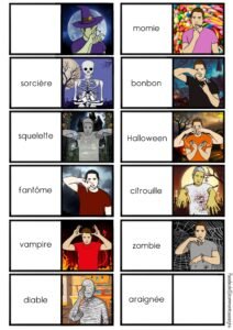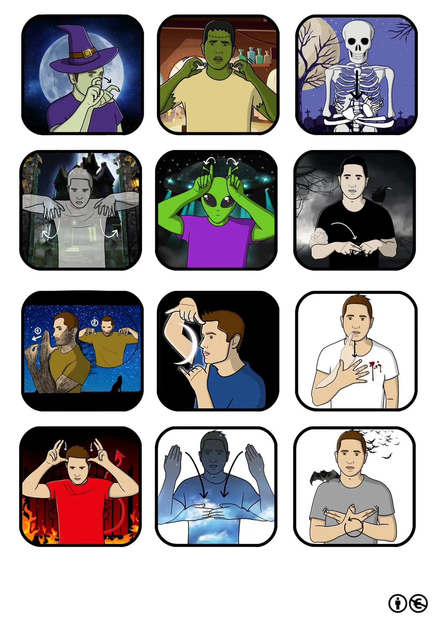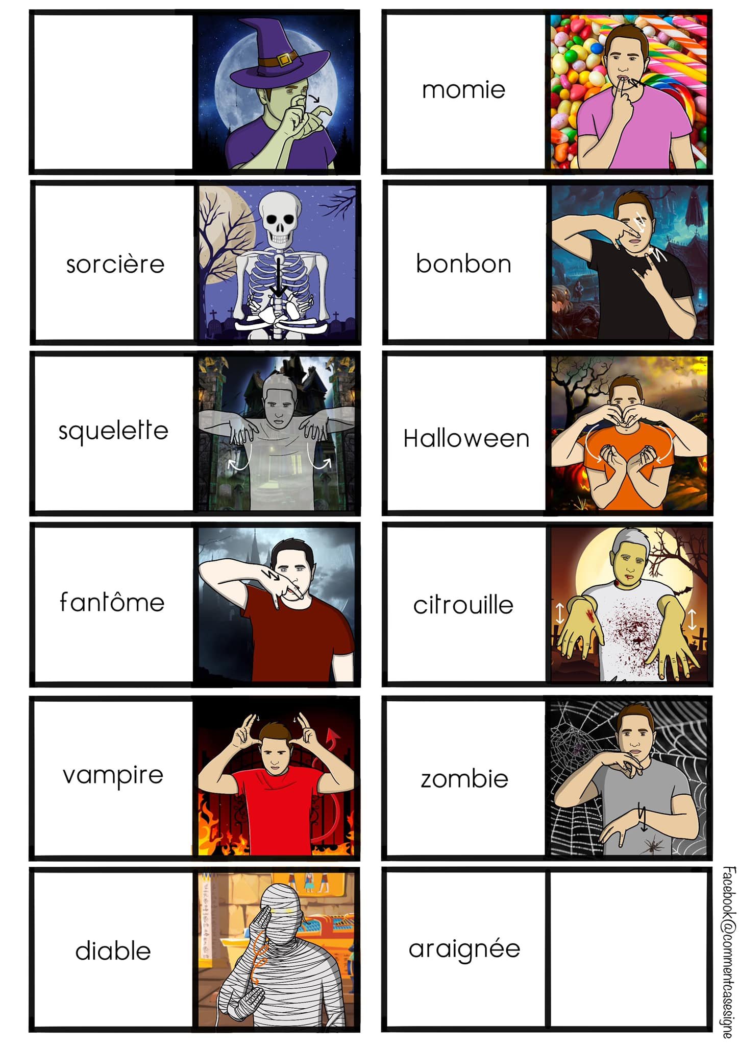 Liste des signes : Halloween, sorcière, zombie, vampire, peur, loup-garou, araignée, citrouille, ogre, nuit, squelette, fantôme, bonbon, lune, mort, diable, momie, sang, chauve-souris, créature de Frankenstein, sort, coup de baguette, déguisement, alien, monstre.