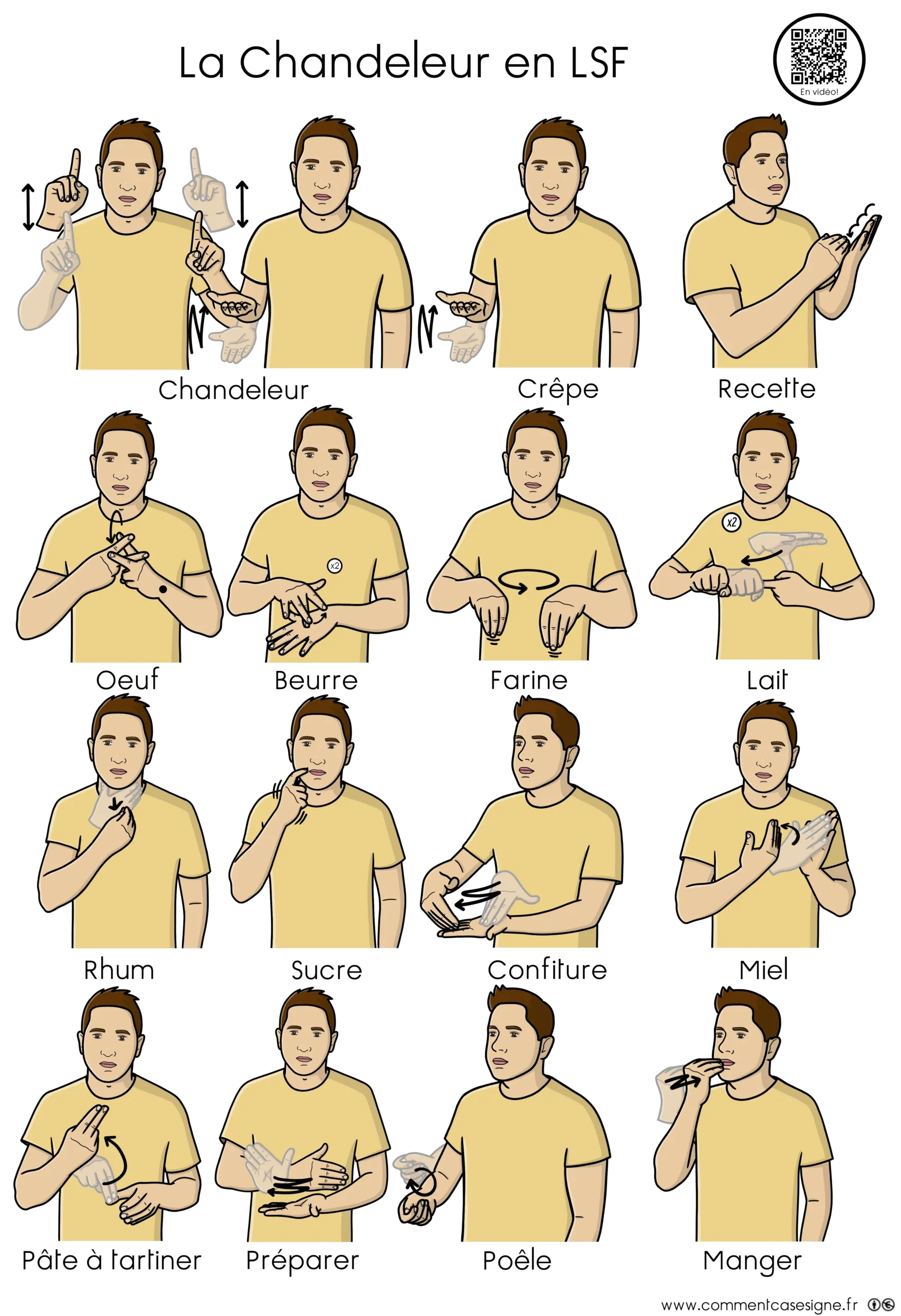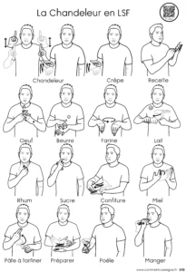 Description : Signaire à imprimer sur le thème de la Chandeleur en LSF (Langue des Signes Française). Il regroupe 15 illustrations accompagnées d’un QR code permettant d’accéder directement à la vidéo de chaque signe. Le signaire est proposé en version couleur et en noir et blanc.