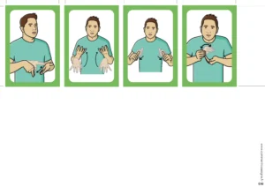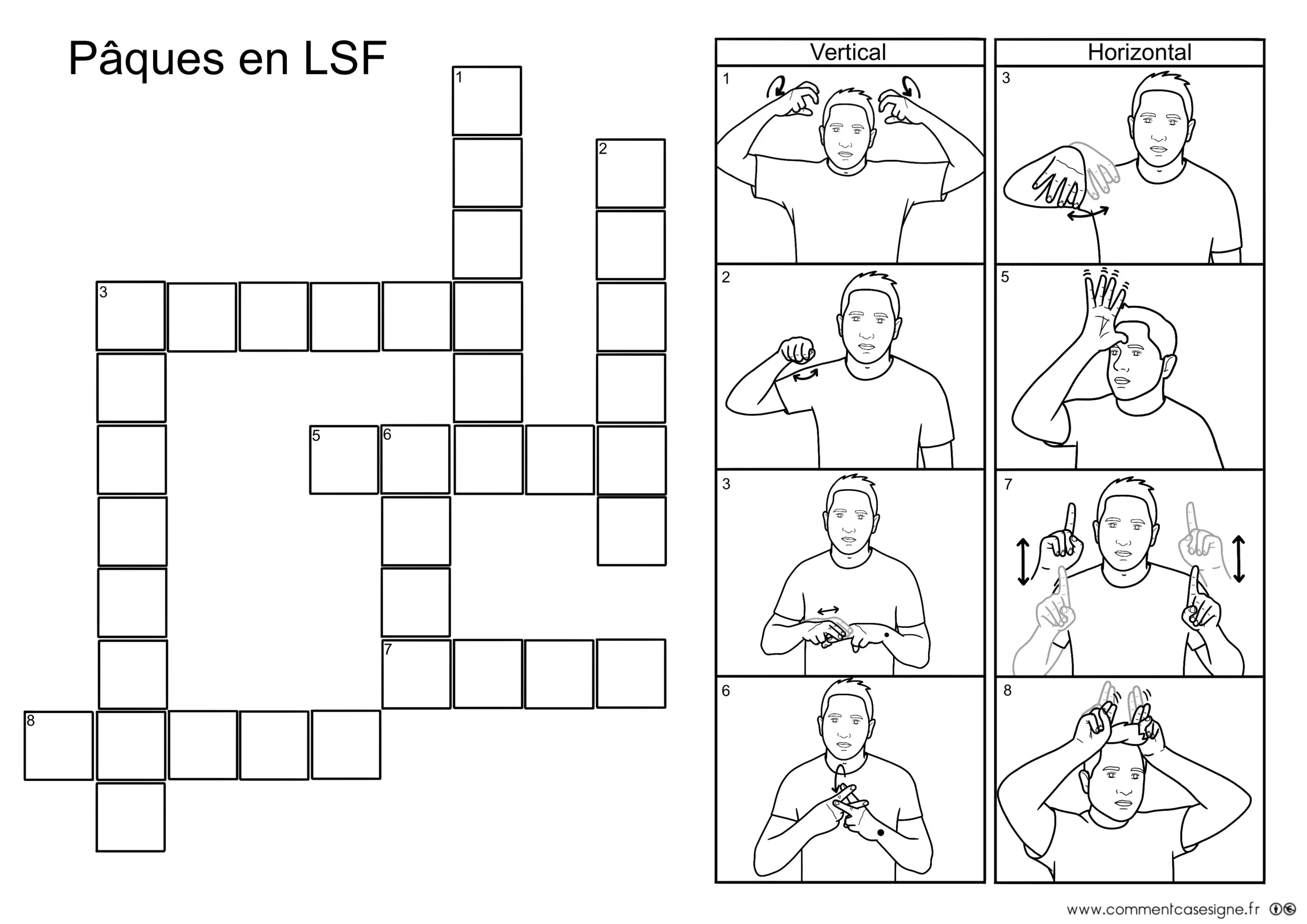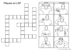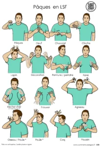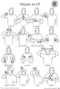 Description : Signaire à imprimer sur le thème de Pâques en LSF (Langue des Signes Française). Il regroupe 15 illustrations accompagnées d’un QR code donnant accès à la vidéo de chaque signe. Le signaire est disponible en version couleur et en noir et blanc.
