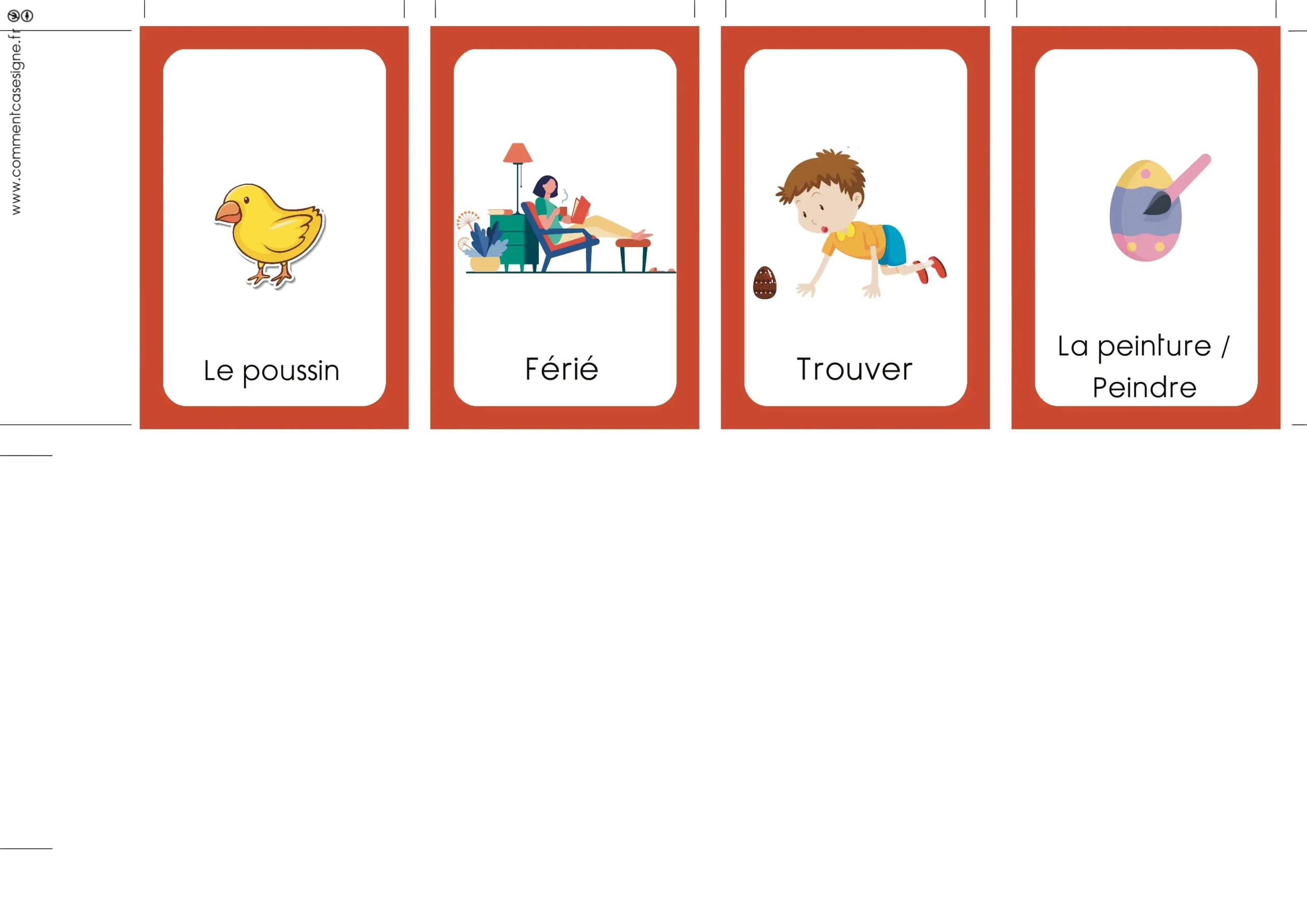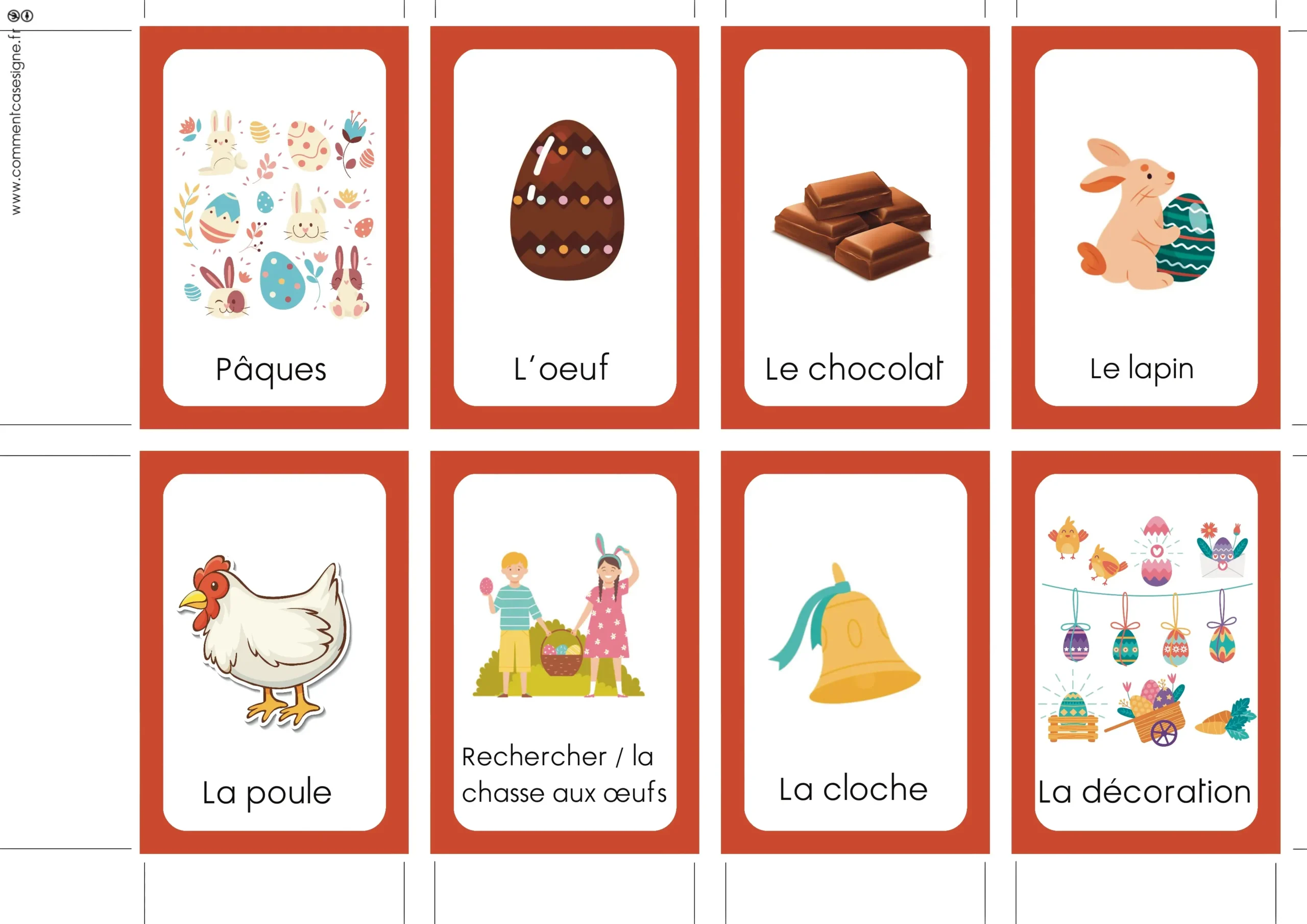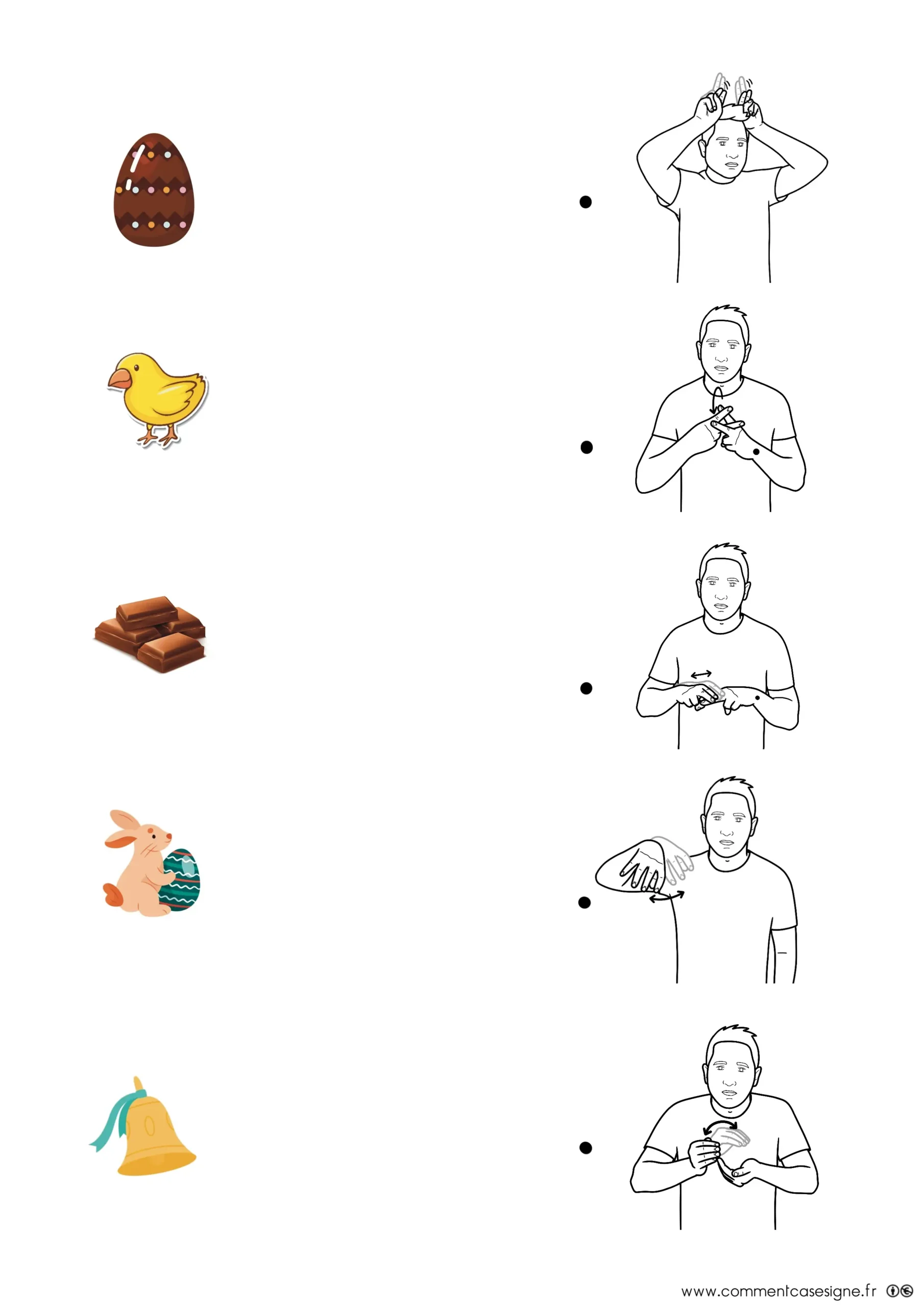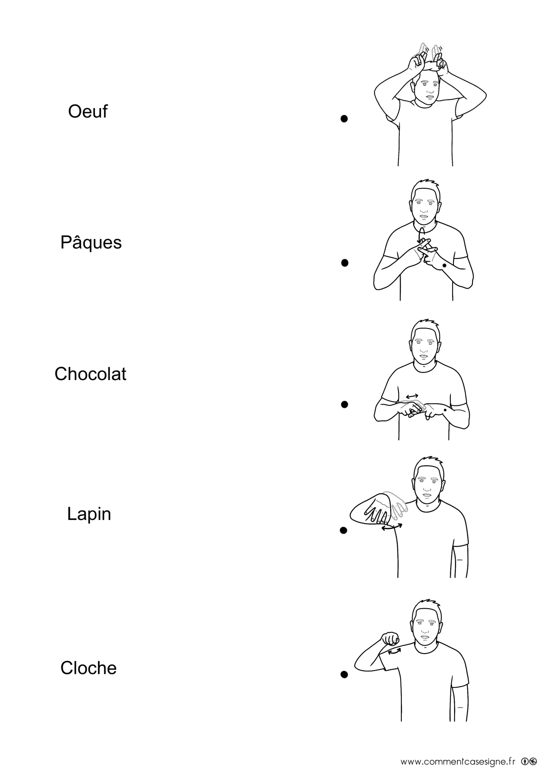 Liste des signes : Pâques, œuf, chocolat, cloche, lapin, décoration, peinture / peindre, férié, rechercher (chasse aux œufs), trouver, agneau, oiseau / poule, poule, coq, poussin.