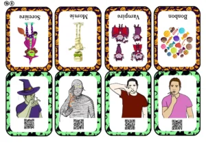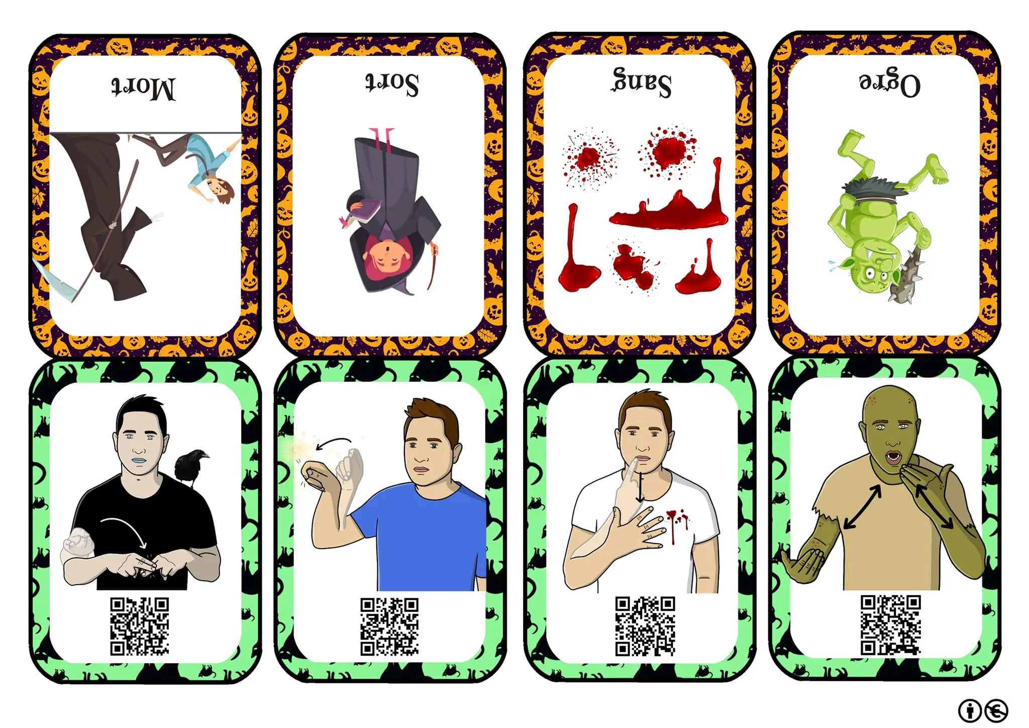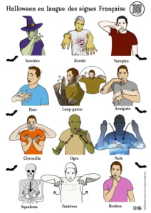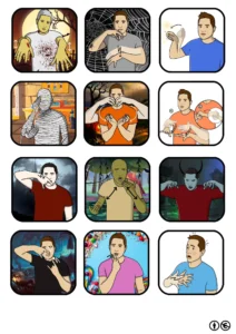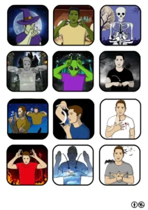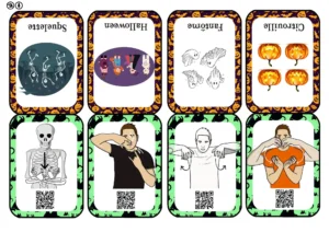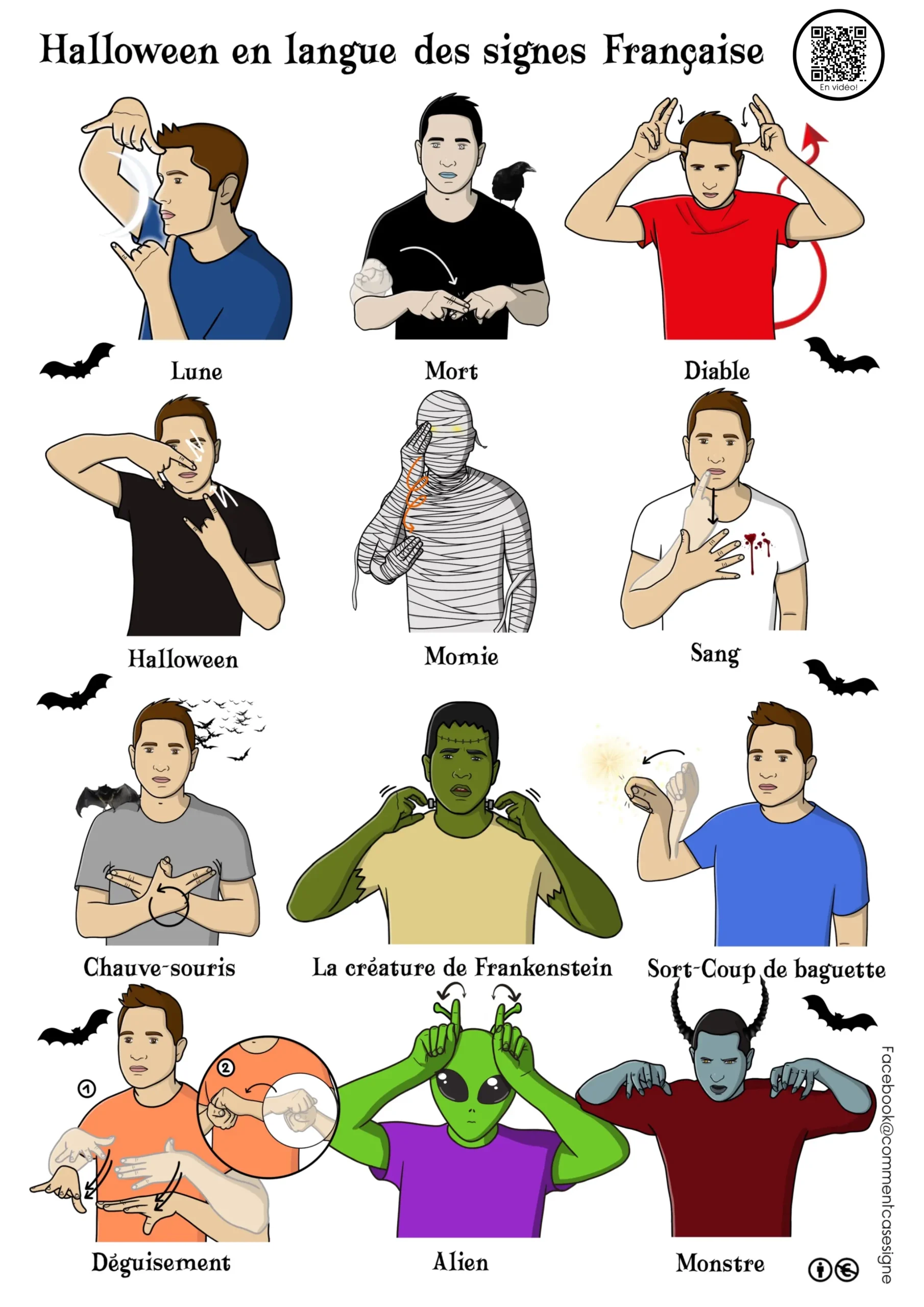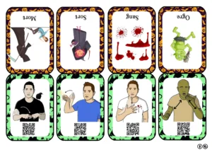 Description : Signaires à imprimer sur le thème d’Halloween en LSF (Langue des Signes Française). Il rassemble 23 illustrations accompagnées d’un QR code permettant d’accéder directement à la vidéo de chaque signe. Les signaires sont disponibles en version couleur et en noir et blanc.