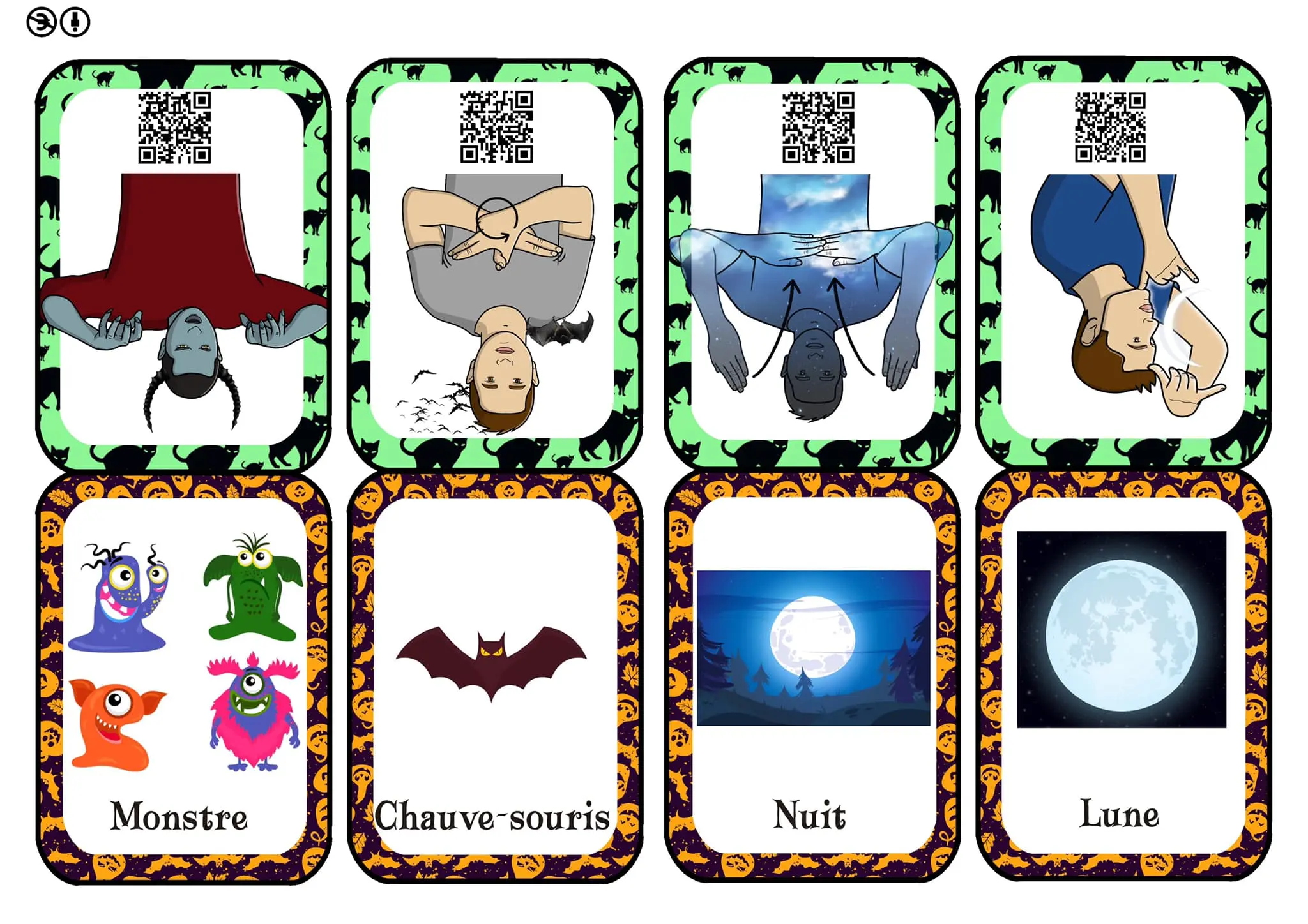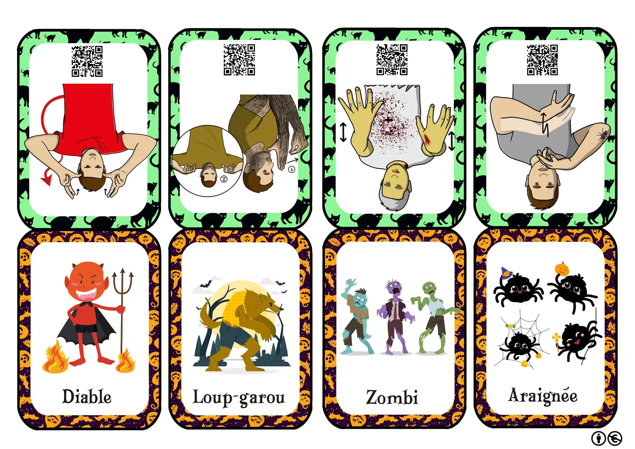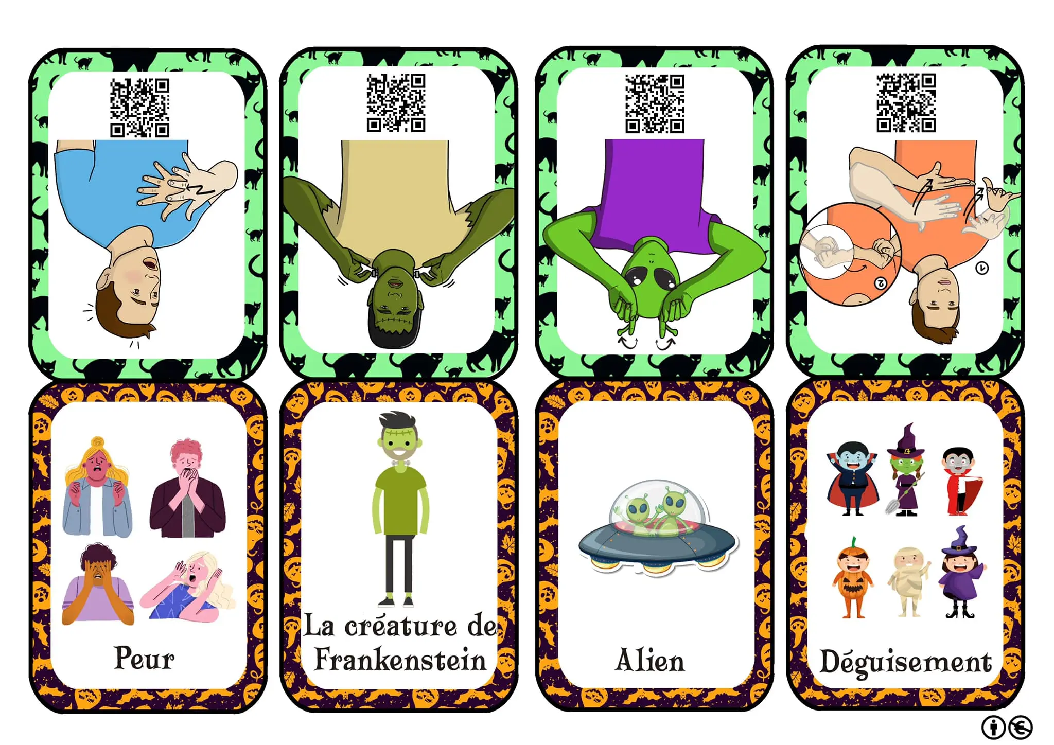 Description : Signaires à imprimer sur le thème d’Halloween en LSF (Langue des Signes Française). Il rassemble 23 illustrations accompagnées d’un QR code permettant d’accéder directement à la vidéo de chaque signe. Les signaires sont disponibles en version couleur et en noir et blanc.