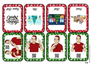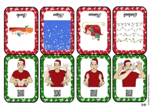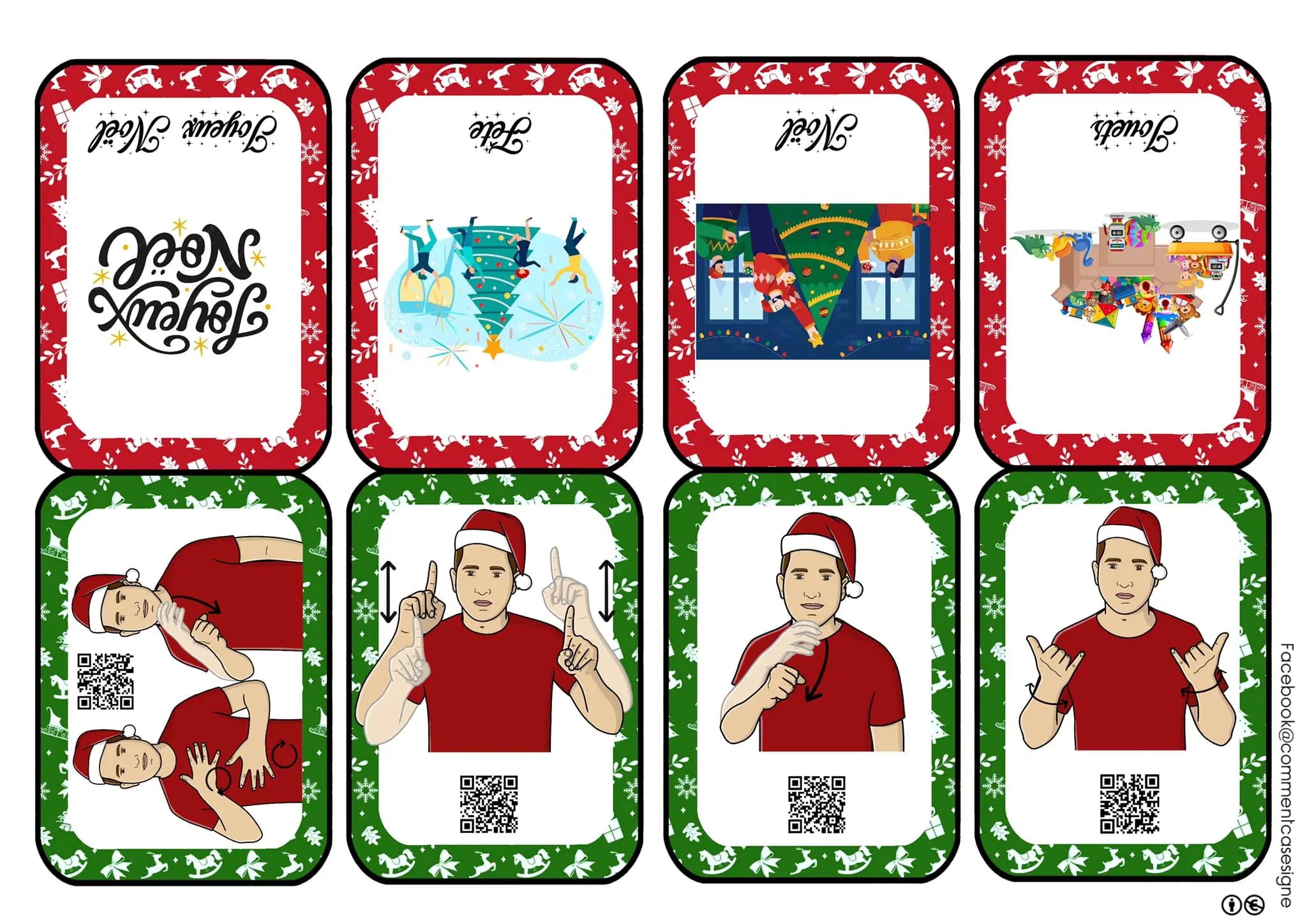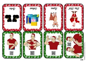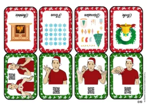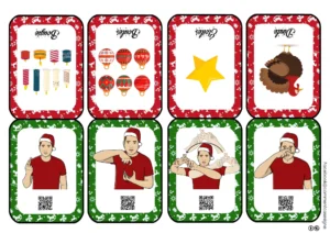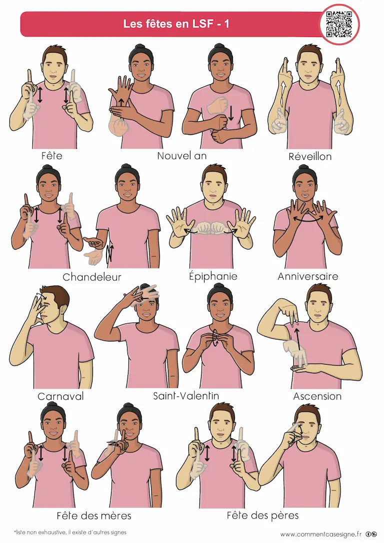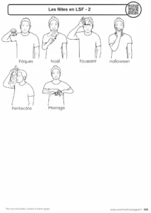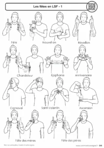 Description : Signaires à imprimer sur le thème des fêtes en LSF (Langue des Signes Française). Il rassemble 22 illustrations accompagnées d’un QR code permettant d’accéder directement à la vidéo de chaque signe. Le signaire est disponible en version couleur et en noir et blanc.