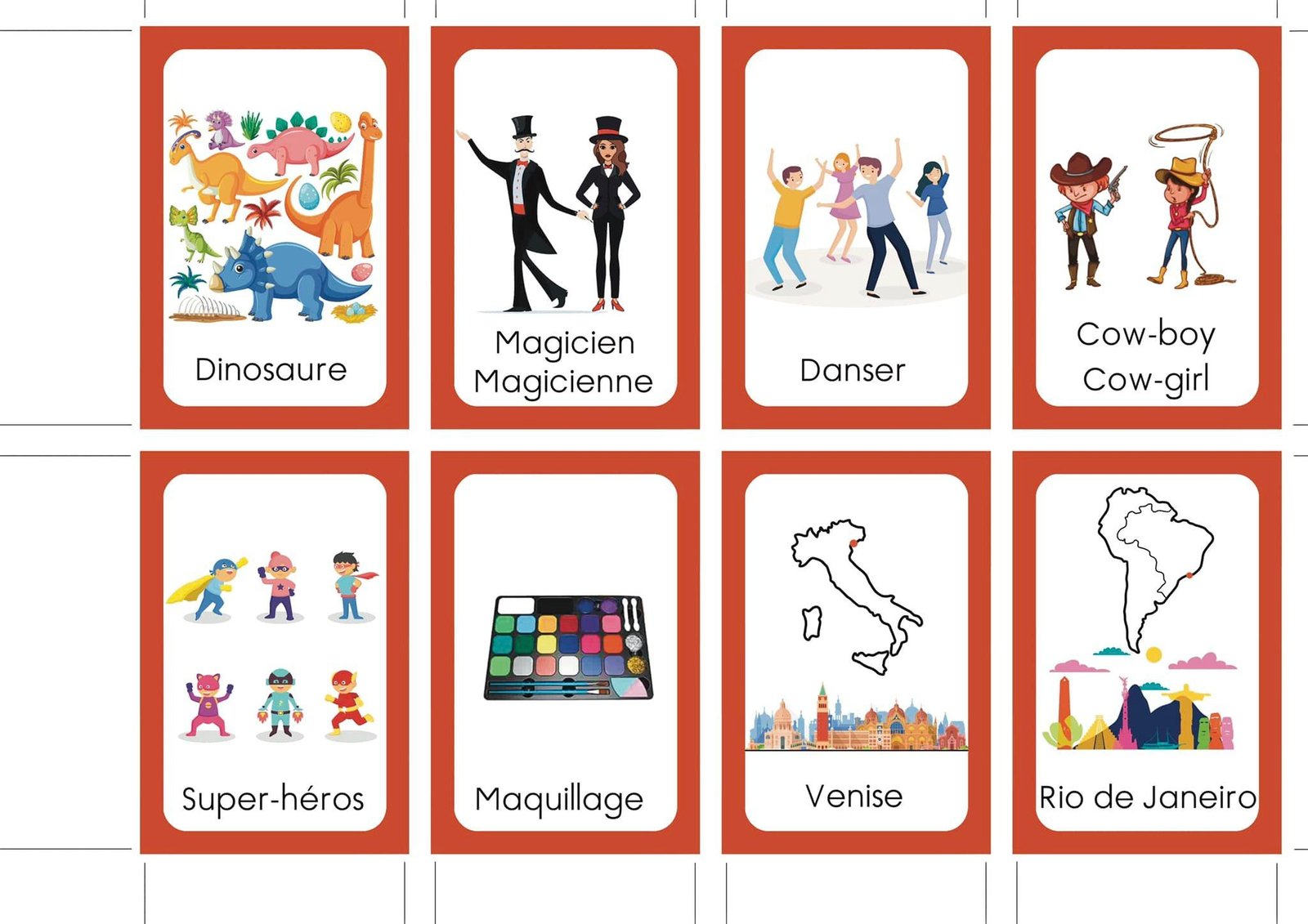 Liste des signes : masque, déguisement, pirate, cow-boy, cow-girl, dinosaure, clown, fée, magicien, magicienne, super-héros, maquillage, danser, défilé, Venise, Rio de Janeiro.