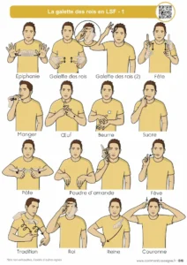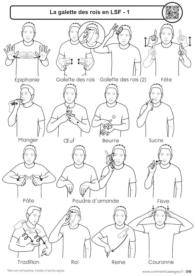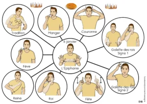 Liste des signes : Épiphanie, tradition, manger, couronne, galette des rois (signe 1), galette des rois (signe 2), fête, roi, reine, fève, manger, oeuf, beurre, sucre, pâte, poudre d’amande.