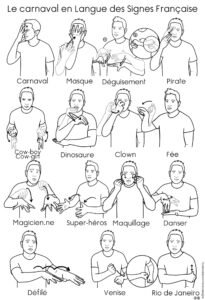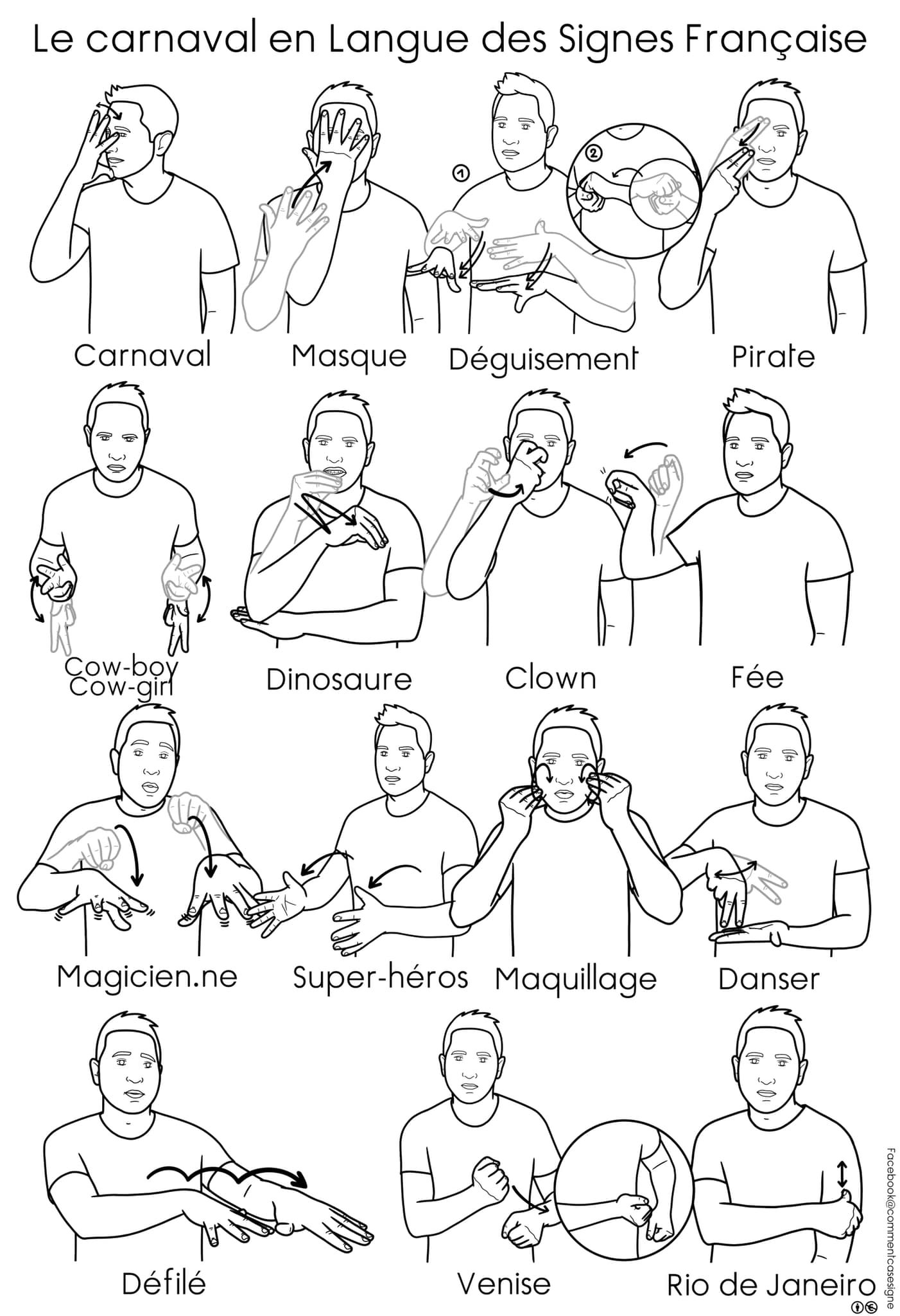 Description : Signaire à imprimer sur le thème du Carnaval en LSF (Langue des Signes Française). Il regroupe 16 illustrations. Le signaire est disponible en version  noir et blanc.