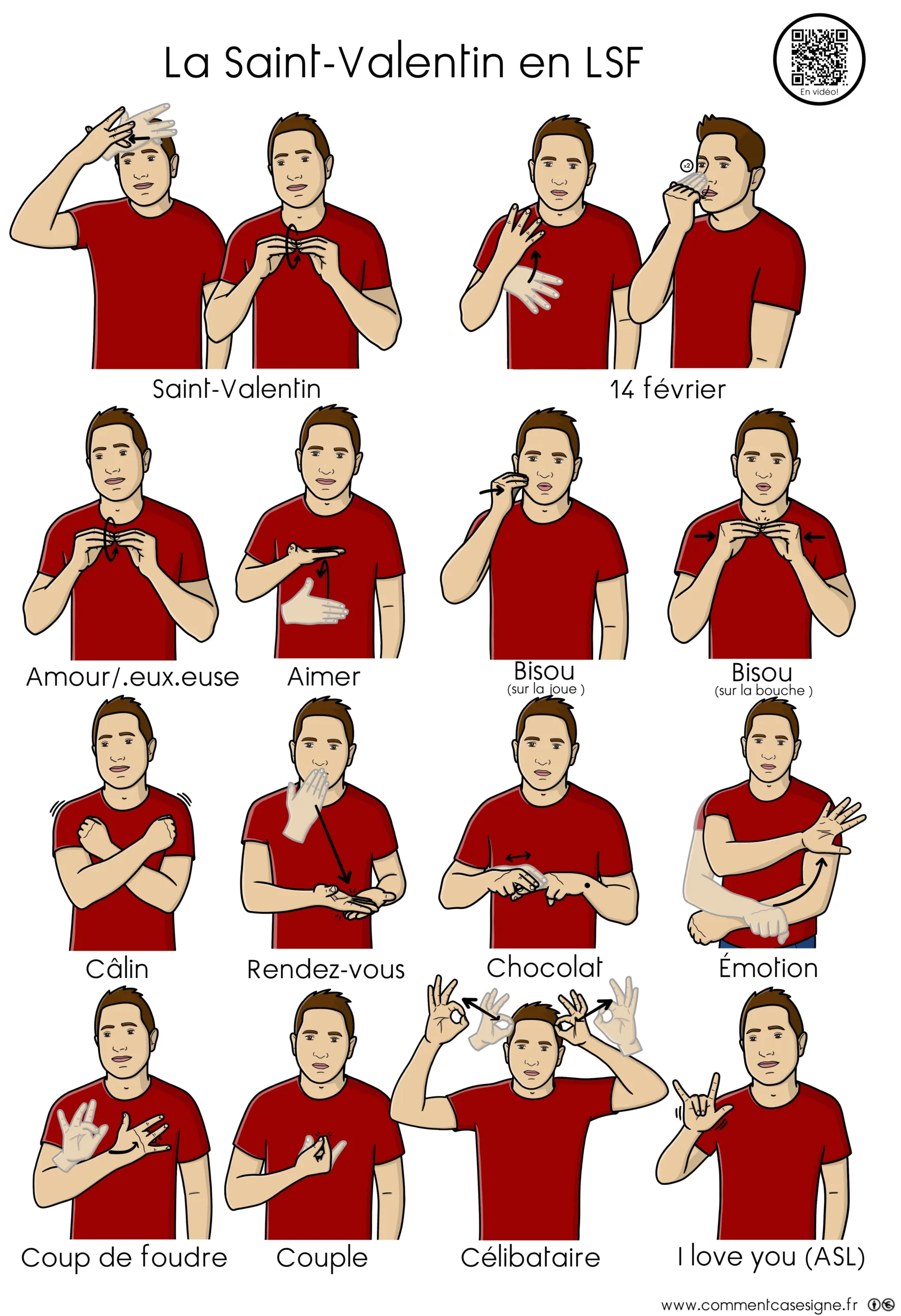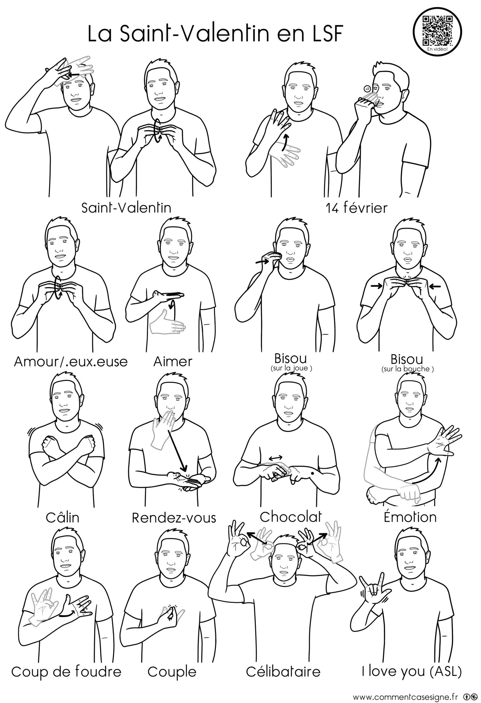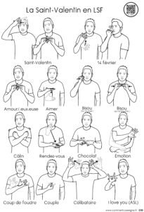 Description : Signaires à imprimer sur le thème de la Saint-Valentin en LSF (Langue des Signes Française). Il rassemble 14 illustrations accompagnées d’un QR code permettant d’accéder directement à la vidéo de chaque signe. Le signaire est disponible en version couleur et en noir et blanc.