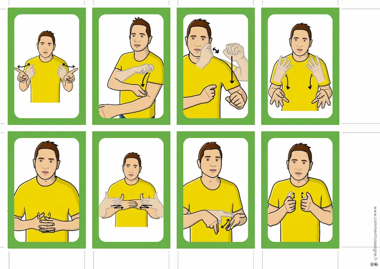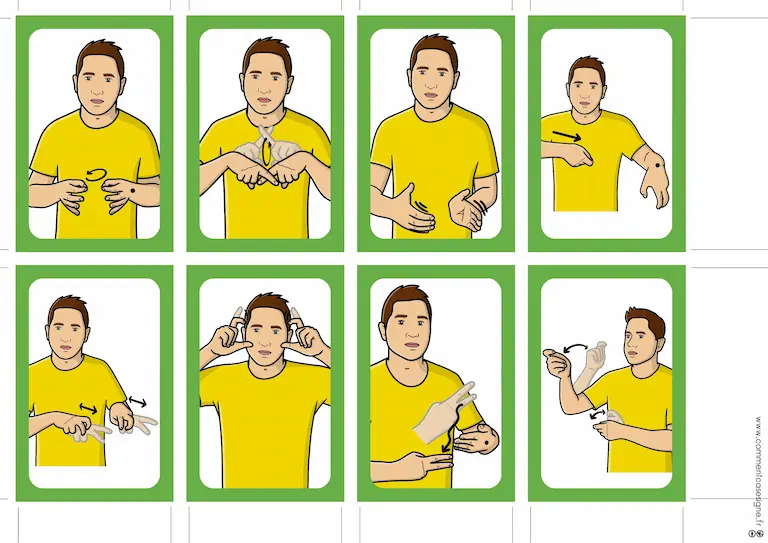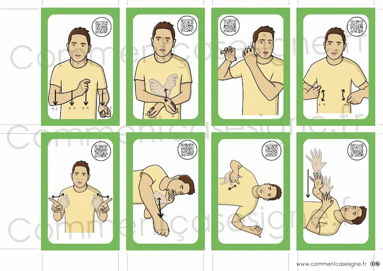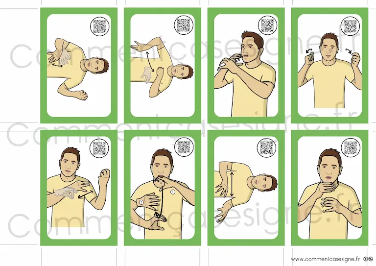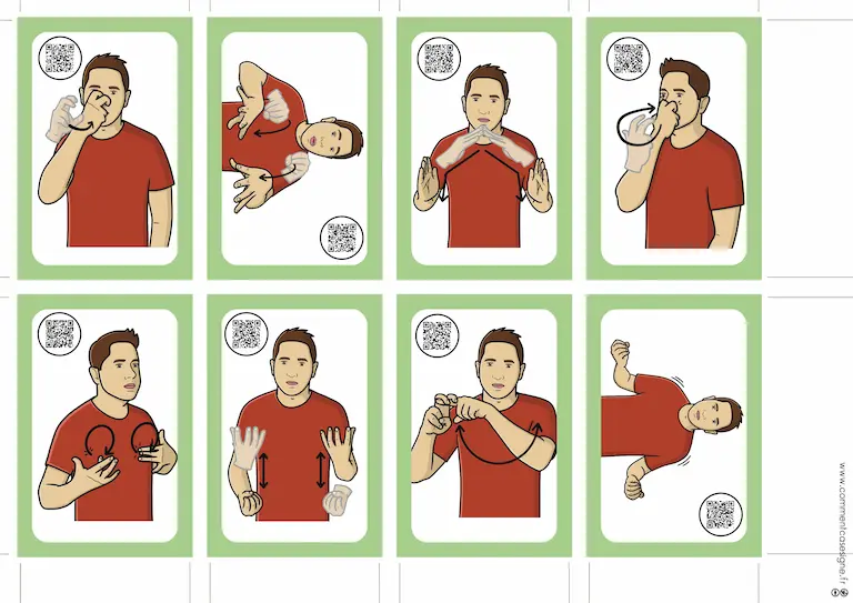 Le signaire est disponible en version couleur et en noir et blanc, et chaque illustration est accompagnée d’un QR code donnant accès à la vidéo du signe.