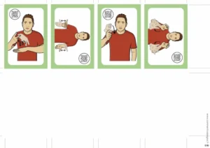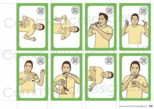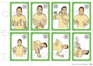 Le signaire est disponible en version couleur et en noir et blanc, et comprend également des flashcards pour favoriser l’apprentissage ludique et la mémorisation.