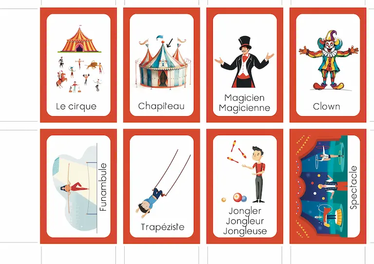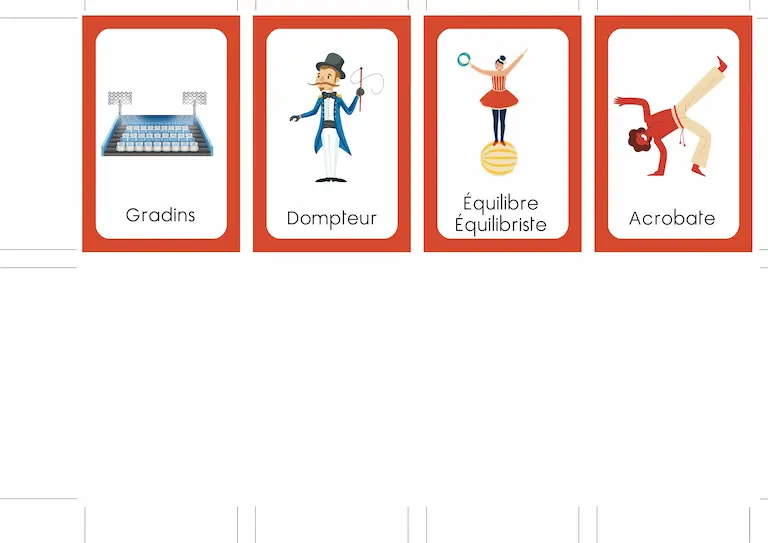 Liste des signes : cirque, chapiteau, spectacle, magie, clown, jongler, trapèze, acrobate, funambule, dompteur, équilibre, gradins.