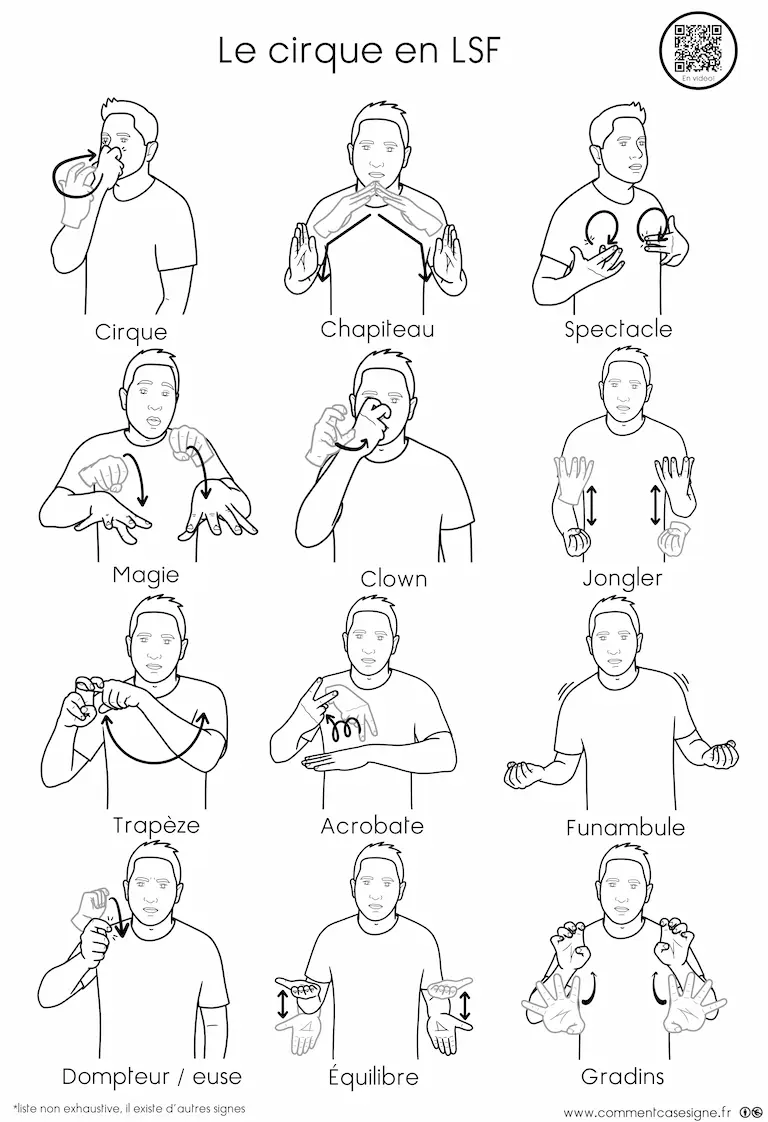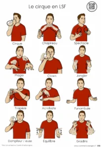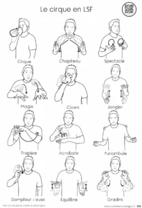 Description : Signaire à imprimer sur le thème du cirque en LSF (Langue des Signes Française). Il permet de découvrir l’univers du cirque et ses disciplines de manière visuelle et accessible.