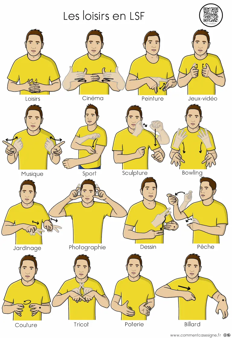Vous trouverez ici un ensemble de ressources en Langue des Signes Française sur les loisirs. Cette page rassemble des signaires thématiques, des jeux de cartes, des mémoris, des dominos, ainsi que des vidéos pour apprendre et pratiquer les signes liés aux loisirs. Bonne exploration !