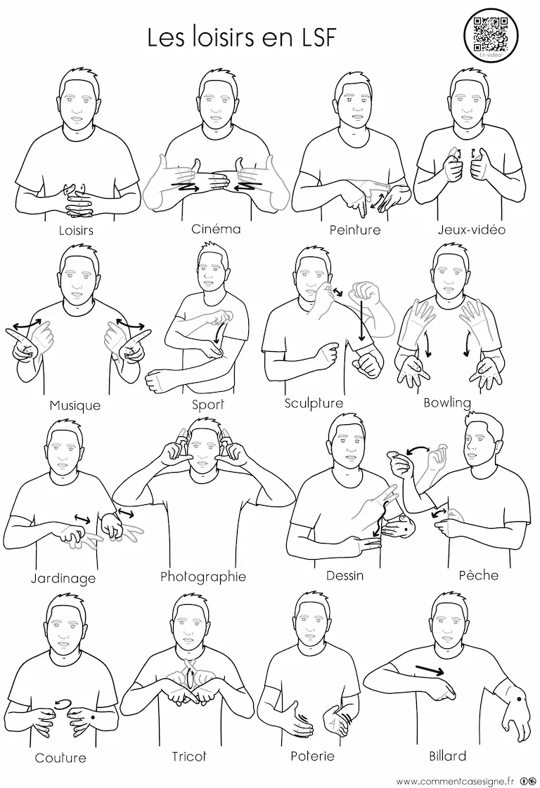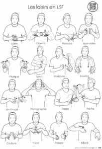 Signaire à imprimer sur le thème des loisirs en LSF (Langue des Signes Française). Il permet de découvrir et de travailler le vocabulaire des activités de loisirs de manière visuelle et accessible.
