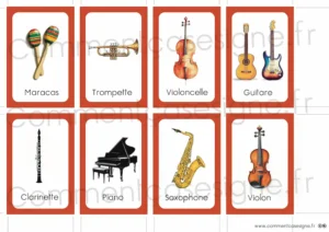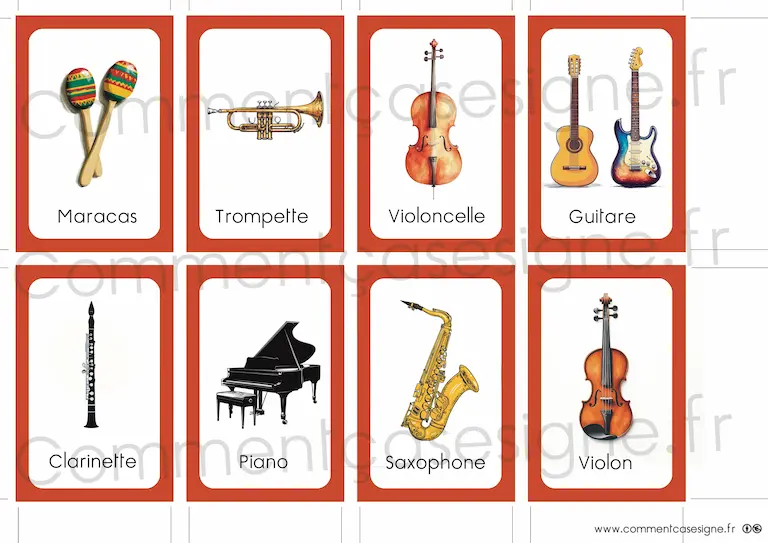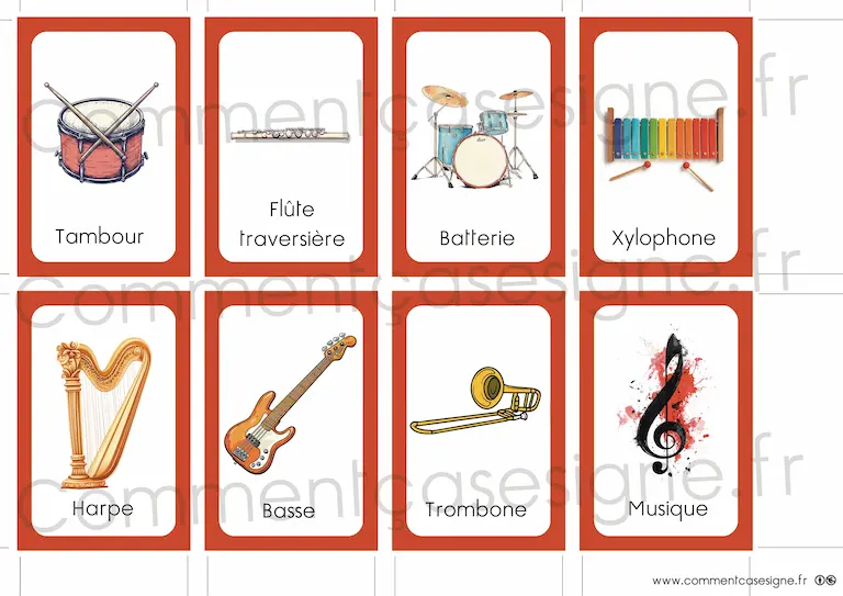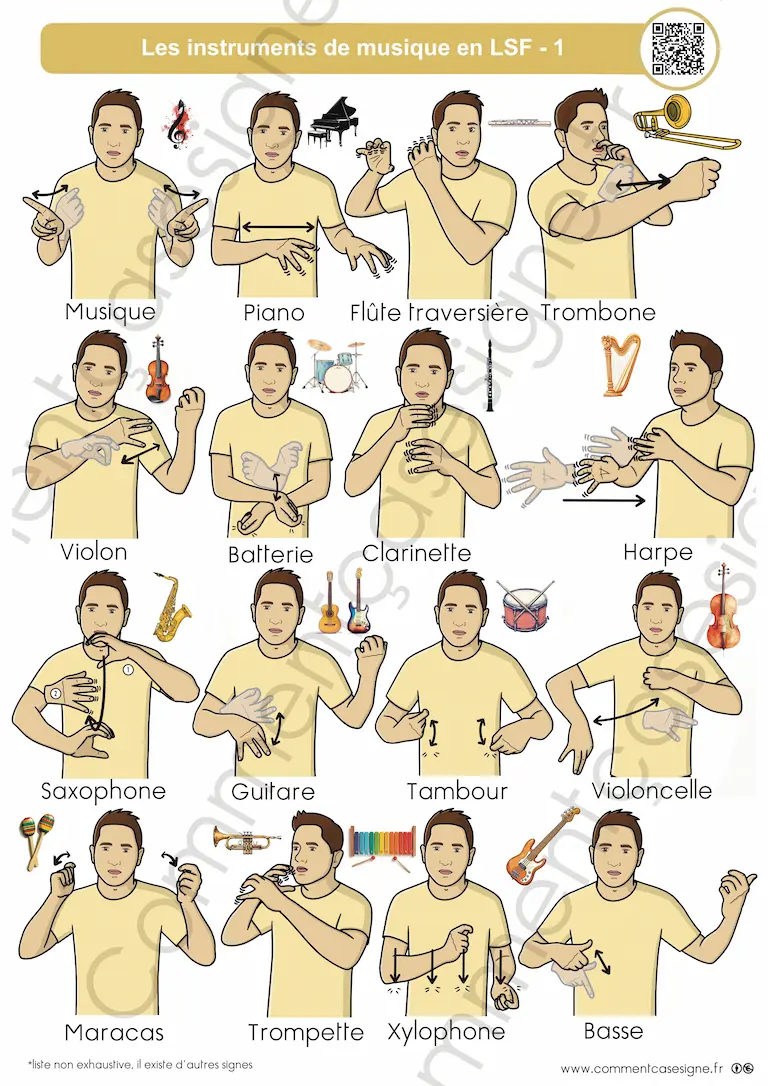 Liste des signes : musique, piano, flûte traversière, trombone, violon, batterie, clarinette, harpe, saxophone, guitare, tambour, violoncelle, maracas, trompette, xylophone, basse.