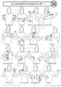 Description : Signaires à imprimer sur le thème des instruments de musique en LSF (Langue des Signes Française).  Le signaire est disponible en version couleur et en noir et blanc, et comprend également des flashcards pour favoriser l’apprentissage ludique et la mémorisation.