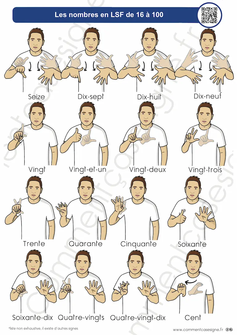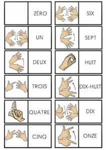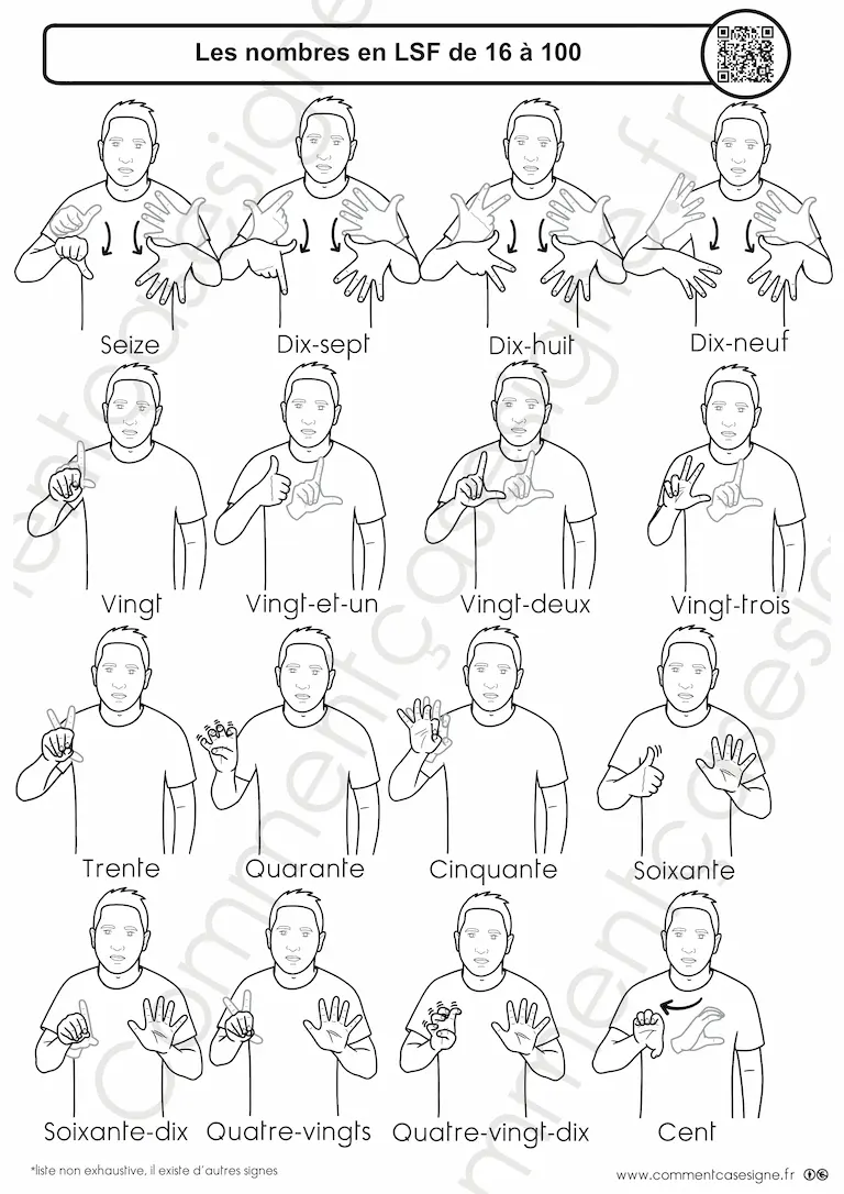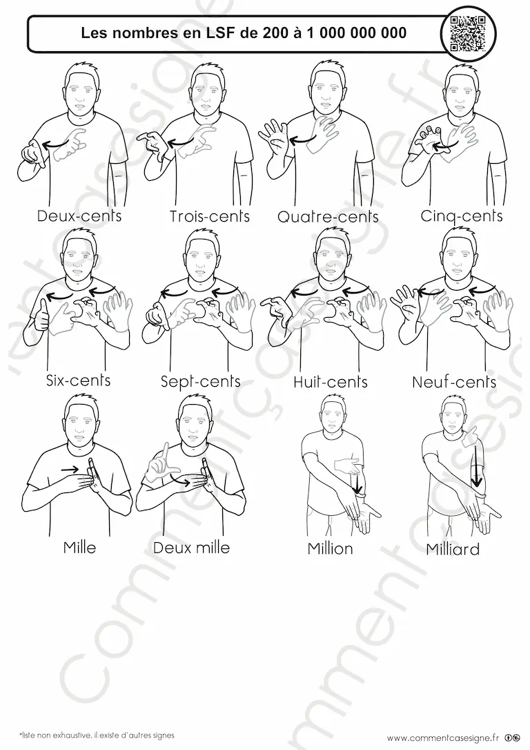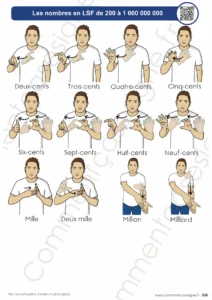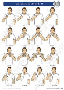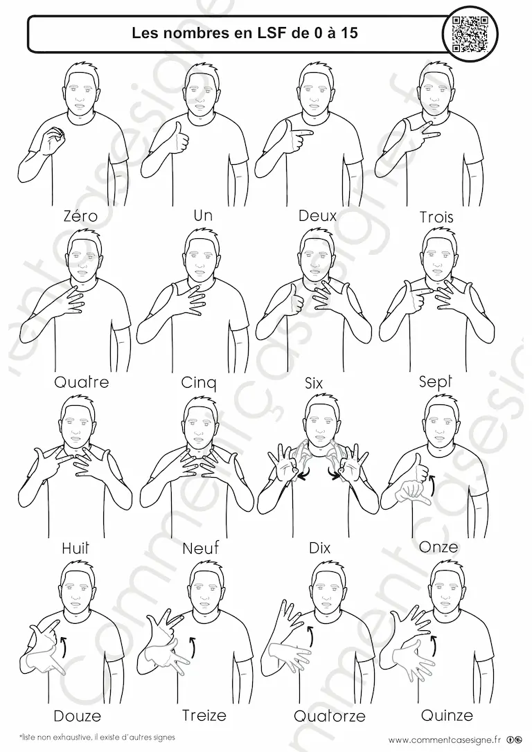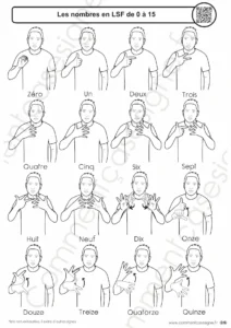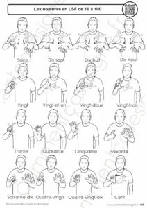 Description : Signaire à imprimer sur le thème des nombres de 0 à 1 milliard en LSF (Langue des Signes Française).  Les signaires regroupent 44 illustrations accompagnées d’un QR code donnant accès à la vidéo de chaque signe. Il est disponible en version couleur et en noir et blanc.