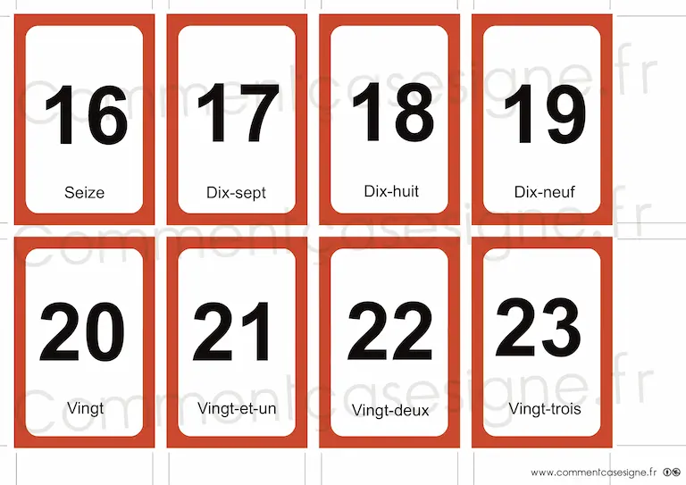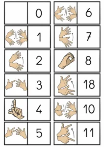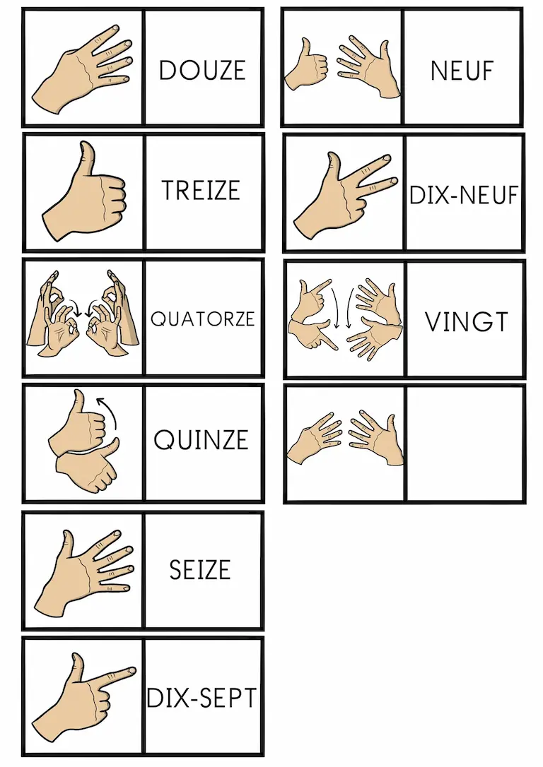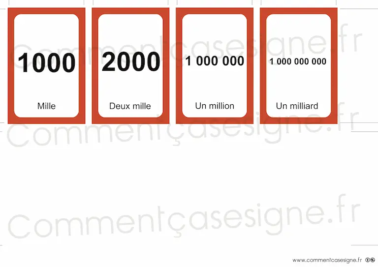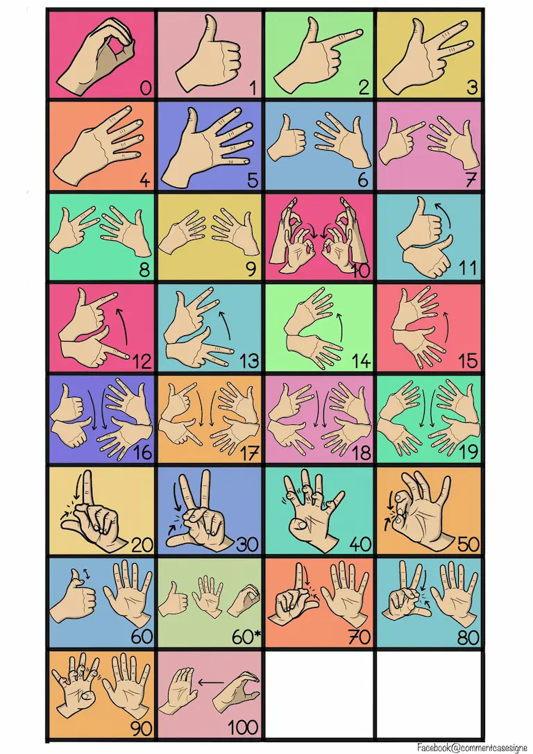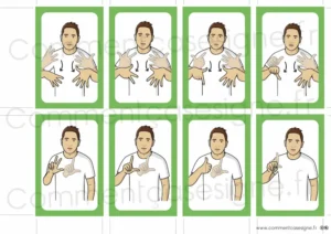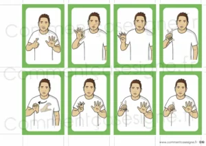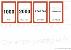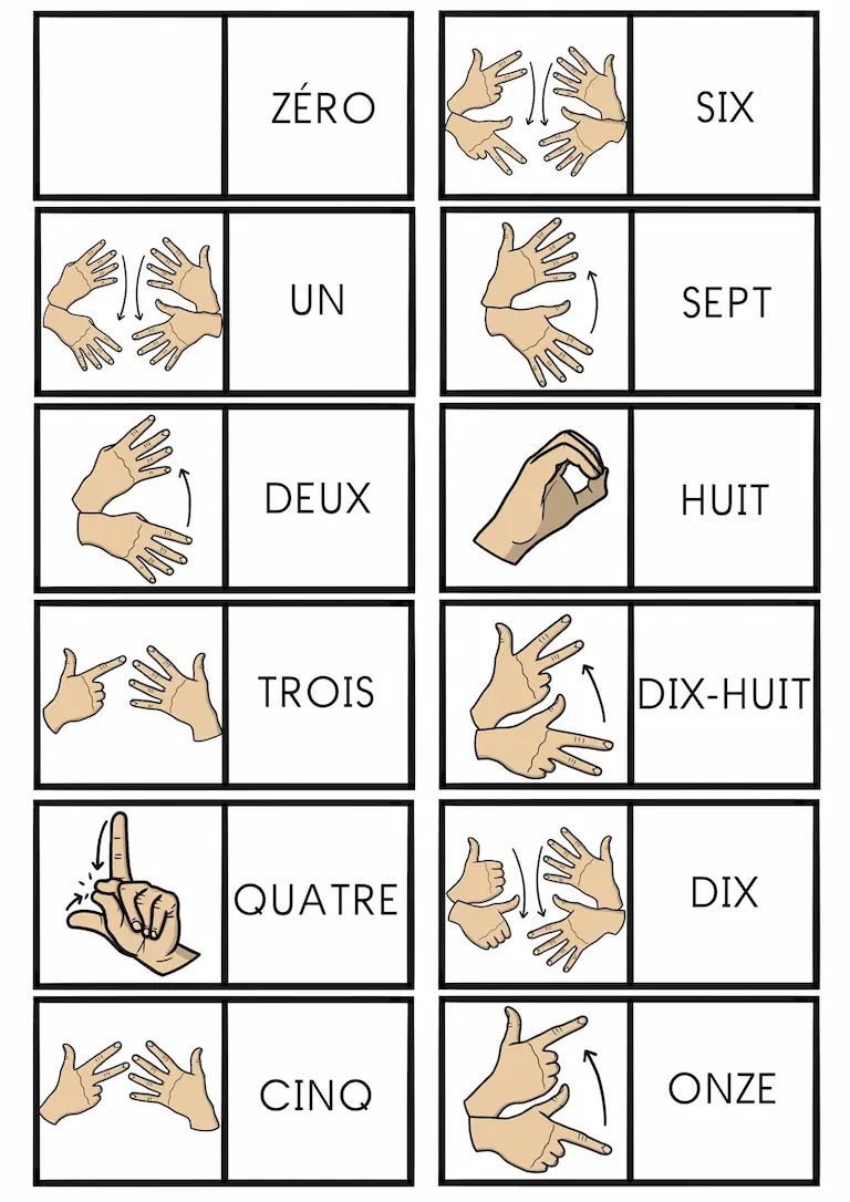 Description : Signaire à imprimer sur le thème des nombres de 0 à 1 milliard en LSF (Langue des Signes Française).  Les signaires regroupent 44 illustrations accompagnées d’un QR code donnant accès à la vidéo de chaque signe. Il est disponible en version couleur et en noir et blanc.