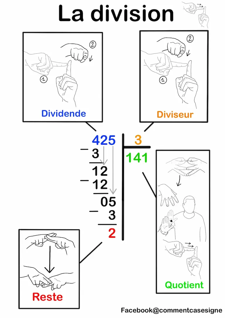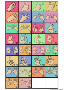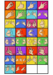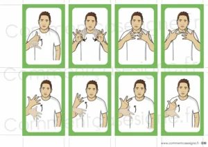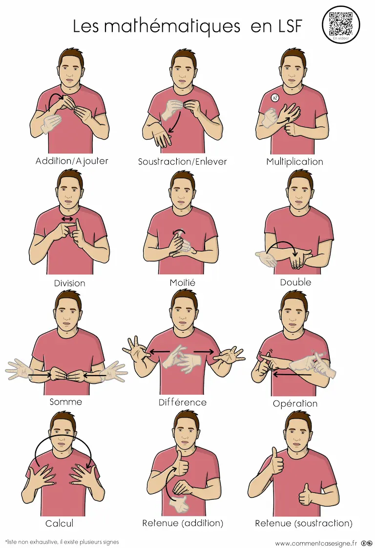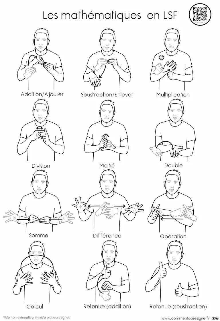 Description : Signaire à imprimer sur le thème des mathématiques en LSF (Langue des Signes Française), partie 1. Il permet d’aborder les principales notions de calcul de manière visuelle et accessible.
