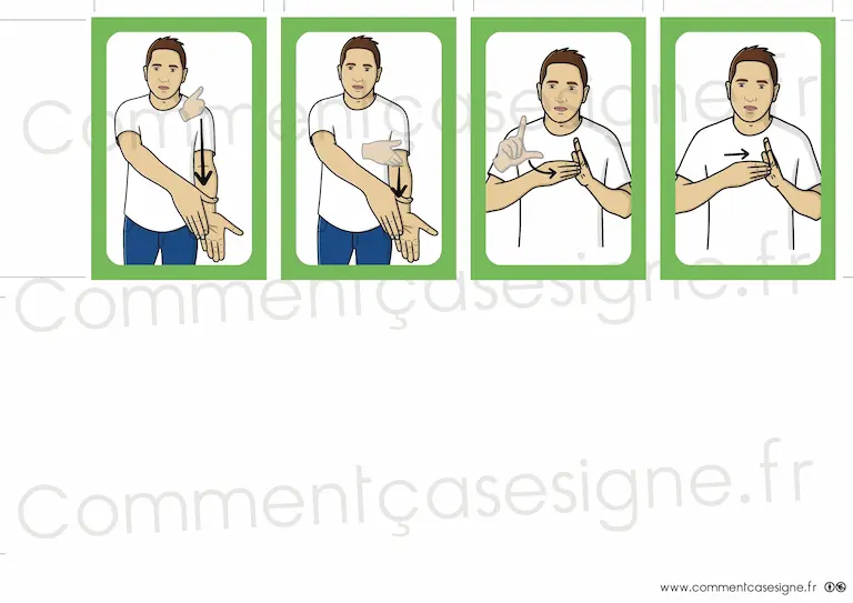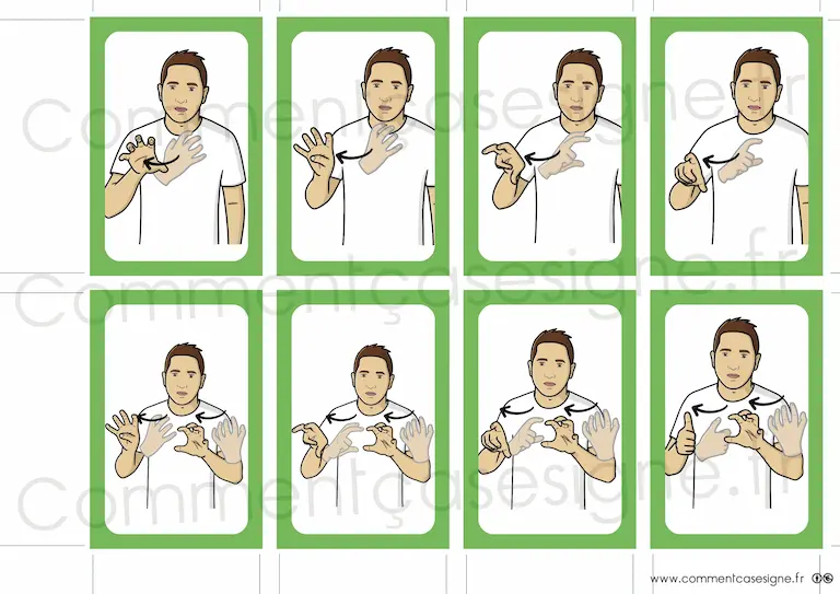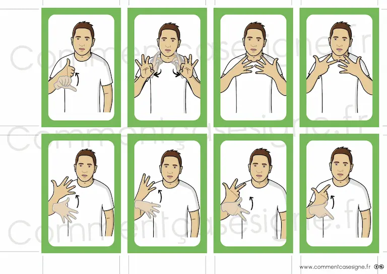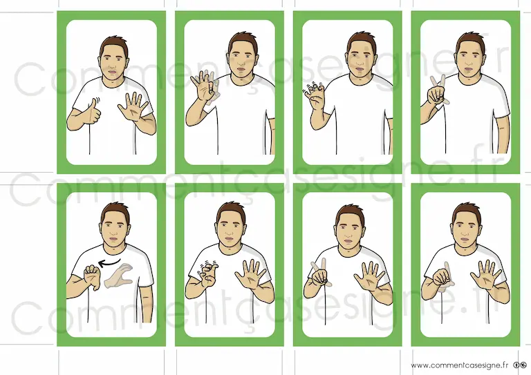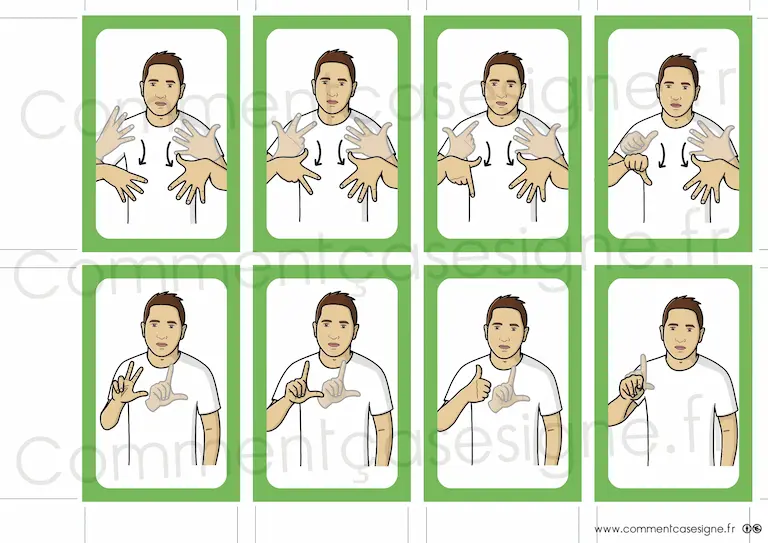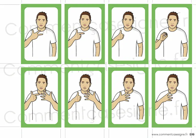 Le signaire regroupe 12 illustrations accompagnées d’un QR code donnant accès à la vidéo de chaque signe. Il est disponible en version couleur et en noir et blanc.