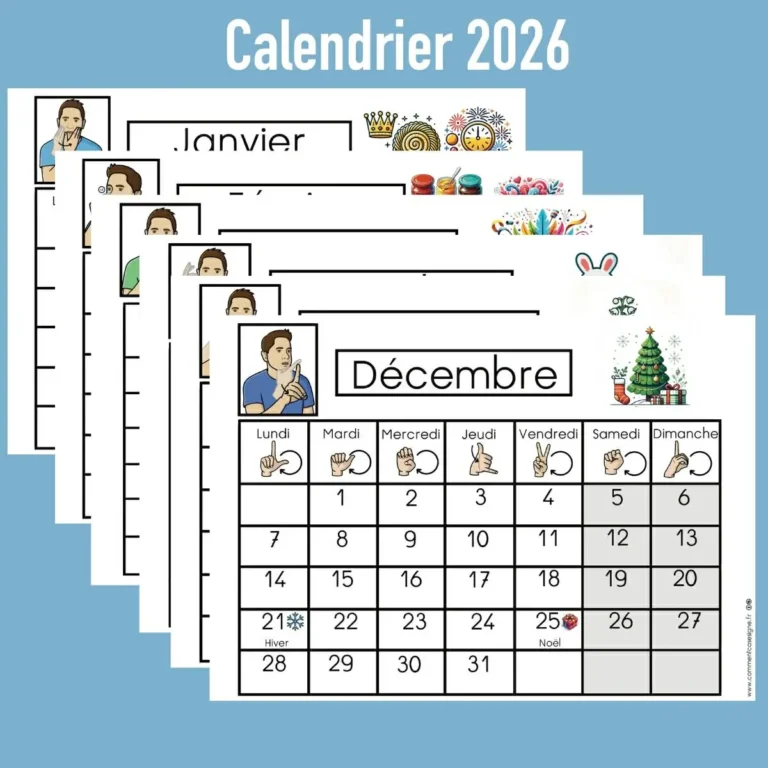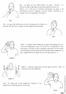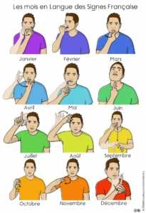 Description : Signaire à imprimer sur le thème des mois de l’année en LSF (Langue des Signes Française). Il permet de découvrir et de mémoriser les signes correspondant aux mois, en lien avec le repérage dans le temps et le calendrier.